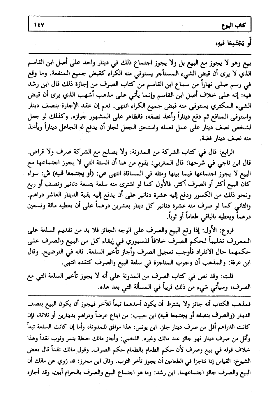 الرابع: قال في كتاب الشركة من المدونة: ولا يصلح مع الشركة صرف ولا قراض قال ابن ناجي في شرحها: قال المغربي يقوم من هنا أن الستة التي لا يجوز اجتماعها مع البيع لا يجوز اجتماعها فيما بينها ومثله في المساقاة انتهى. ص: (أو يجتمعا فيه) ش: سواء كان البيع أكثر أو الصرف أكثر فالأول كما لو اشترى منه سلعة بتسعة دنانير ونصف أو ربع ونحو ذلك من الكسور ودفع إليه عشرة دنانير على أن يدفع إليه بقية الدينار العاشر دراهم، والثاني كما لو صرف منه عشرة دنانير كل دينار بعشرين درهما على أن يعطيه مائة وتسعين درهما ويعطيه بالباقي طعاما أو ثوبا.