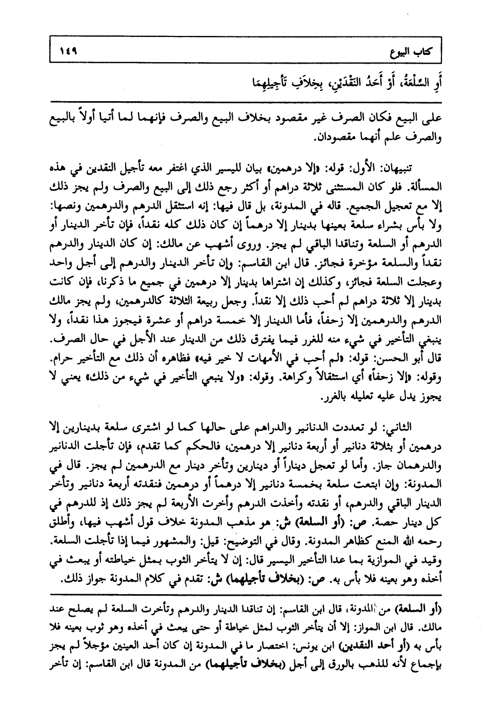 الثاني: لو تعددت الدنانير والدراهم على حالها، كما لو اشترى سلعة بدينارين إلا درهمين أو بثلاثة دنانير أو أربعة دنانير إلا درهمين فالحكم، كما تقدم فإن تأجلت الدنانير والدرهمان جاز وأما لو تعجل دينارا أو دينارين وتأخر دينار مع الدرهمين لم يجز، قال في المدونة: وإن ابتعت سلعة بخمسة دنانير إلا درهما أو درهمين فنقدته أربعة دنانير وتأخر الدينار الباقي والدرهم أو نقدته وأخذت الدرهم، وأخرت الأربعة لم يجز ذلك إذ للدرهم في كل دينار حصة ص: (أو السلعة) ش: هو مذهب المدونة خلاف قول أشهب فيها وأطلق رحمه الله المنع كظاهر المدونة، وقال في التوضيح قيل: والمشهور فيما إذا تأجلت السلعة وقيد في الموازية بما عدا التأخير اليسير قال: أن لا يتأخر الثوب بمثل خياطته أو يبعث في أخذه، وهو بعينه فلا بأس به. ص: (بخلاف تأجيلهما) ش: تقدم في كلام المدونة جواز ذلك.