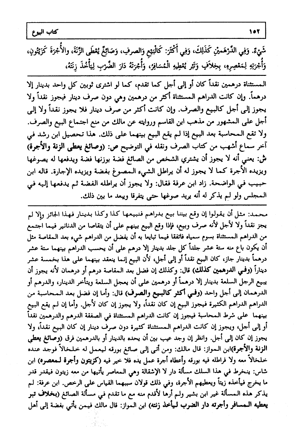 المستثناة درهمين نقدا كان أو إلى أجل، كما تقدم، كما لو اشترى ثوبين كل واحد بدينار إلا درهما، وإن كانت الدراهم المستثناة أكثر من درهمين وهي دون صرف دينار فيجوز نقدا ولا يجوز إلى أجل كالبيع والصرف، وإن كانت أكثر من صرف دينار فلا يجوز نقدا ولا يجوز إلى أجل كالبيع والصرف، وإن كانت أكثر من صرف دينار فلا يجوز نقدا ولا إلى أجل على المشهور من مذهب ابن القاسم، وروايته عن مالك من منع اجتماع البيع والصرف ولا تقع المحاسبة بعد البيع إذا لم يقع البيع بينهما على ذلك هذا تحصيل ابن رشد في آخر سماع أشهب من كتاب الصرف، ونقله في التوضيح.ص: (وصائغ يعطى الزنة والأجرة) ش: يعني أنه لا يجوز أن يشتري الشخص من الصائغ فضة بوزنها فضة ويدفعها له يصوغها ويزيده الأجرة، كما لا يجوز له أن يراطل الشيء المصوغ بفضة ويزيده الإجارة، قاله ابن حبيب في الواضحة زاد ابن عرفة فقال: ولا يجوز أن يراطله الفضة، ثم يدفعها إليه في المجلس ولو لم يذكر له أنه يريد صوغها حتى يتفرقا ويبعد ما بين ذلك.