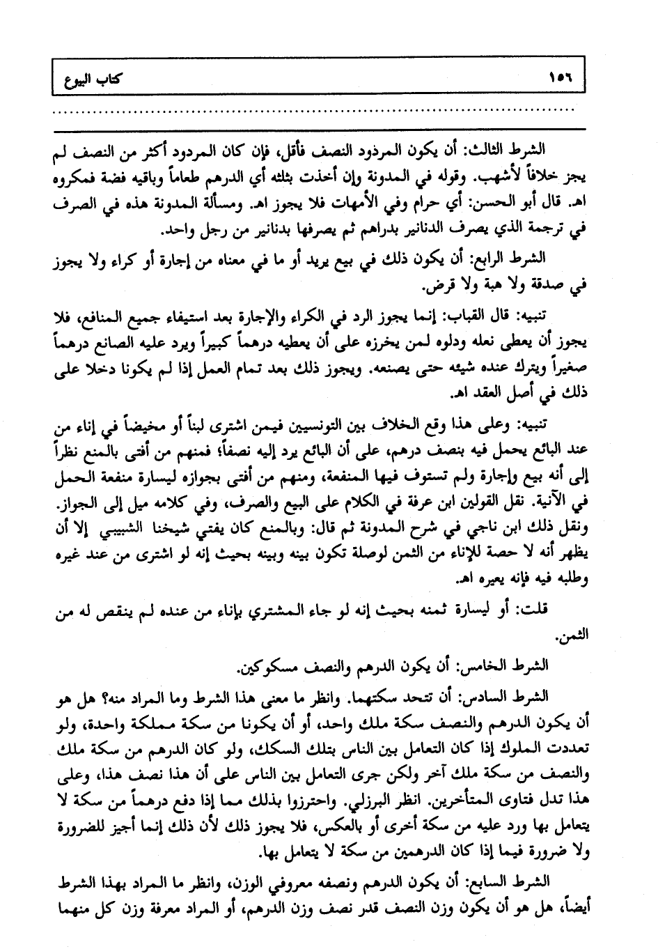 الشرط السادس: أن تتحد سكتهما وانظر ما معنى هذا الشرط وما المراد منه هل هو أن يكون الدرهم والنصف سكة ملك واحد أو أن يكونا من سكة مملكة واحدة ولو تعددت الملوك إذا كان التعامل بين الناس بتلك السكك ولو كان الدرهم من سكة ملك والنصف من سكة ملك آخر ولكن جرى التعامل بين الناس على أن هذا نصف هذا وعلى هذا تدل فتاوى المتأخرين انظر البرزلي واحترزوا بذلك عما إذا دفع درهما من سكة لا يتعامل بها ورد عليه من سكة أخرى أو بالعكس فلا يجوز ذلك؛ لأن ذلك إنما أجيز للضرورة ولا ضرورة فيما إذا كان أحد الدرهمين من سكة لا يتعامل بها.