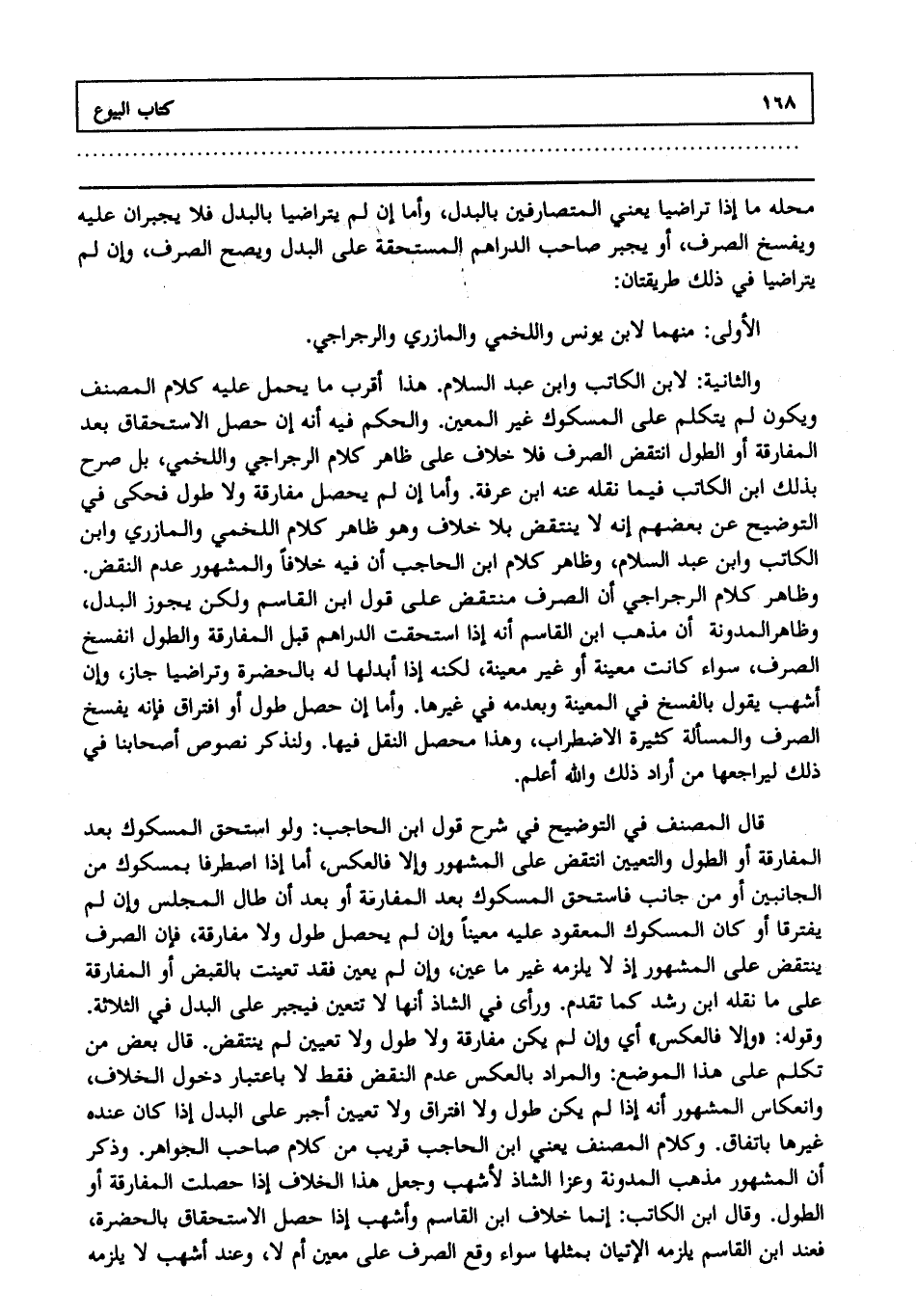 قَالَ الْمُصَنِّفُ فِي التَّوْضِيحِ فِي شَرْحِ قَوْلِ ابْنِ الْحَاجِبِ: وَلَوْ اُسْتُحِقَّ الْمَسْكُوكُ بَعْدَ الْمُفَارَقَةِ أَوْ الطُّولِ وَالتَّعْيِينِ اُنْتُقِضَ عَلَى الْمَشْهُورِ وَإِلَّا فَالْعَكْسُ مَا إذَا اصْطَرَفَا بِمَسْكُوكٍ مِنْ الْجَانِبَيْنِ أَوْ مِنْ جَانِبٍ فَاسْتُحِقَّ الْمَسْكُوكُ بَعْدَ الْمُفَارَقَةِ أَوْ بَعْدَ أَنْ طَالَ الْمَجْلِسُ، وَإِنْ لَمْ يَفْتَرِقَا أَوْ كَانَ الْمَسْكُوكُ الْمَعْقُودُ عَلَيْهِ مُعَيَّنًا، وَإِنْ لَمْ يَحْصُلْ طُولٌ وَلَا مُفَارَقَةٌ فَإِنَّ الصَّرْفَ يُنْتَقَضُ عَلَى الْمَشْهُورِ إذْ لَا يَلْزَمُهُ غَيْرُ مَا عَيَّنَ، وَإِنْ لَمْ يُعَيِّنْ فَقَدْ تَعَيَّنَتْ بِالْقَبْضِ أَوْ الْمُفَارَقَةِ عَلَى مَا نَقَلَهُ ابْنُ رُشْدٍ كَمَا تَقَدَّمَ وَرَأَى فِي الشَّاذِّ أَنَّهَا لَا تَتَعَيَّنُ، فَيُجْبَرُ عَلَى الْبَدَلِ فِي الثَّلَاثَةِ وَقَوْلُهُ: وَإِلَّا فَالْعَكْسُ أَيْ، وَإِنْ لَمْ يَكُنْ مُفَارَقَةٌ وَلَا طُولٌ وَلَا تَعْيِينٌ لَمْ يُنْتَقَضْ قَالَ بَعْضُ مَنْ تَكَلَّمَ عَلَى هَذَا الْمَوْضُوعِ: وَالْمُرَادُ بِالْعَكْسِ عَدَمُ النَّقْضِ فَقَطْ لَا بِاعْتِبَارِ دُخُولِ الْخِلَافِ، وَانْعِكَاسِ الْمَشْهُورِ أَنَّهُ إذَا لَمْ يَكُنْ طُولٌ وَلَا افْتِرَاقٌ وَلَا تَعْيِينٌ أُجْبِرَ عَلَى الْبَدَلِ إذَا كَانَ عِنْدَهُ غَيْرُهَا بِاتِّفَاقٍ، وَكَلَامُ الْمُصَنِّفِ يَعْنِي ابْنَ الْحَاجِبِ قَرِيبٌ مِنْ كَلَامِ صَاحِبِ الْجَوَاهِرِ وَذَكَرَ أَنَّ الْمَشْهُورَ مَذْهَبُ الْمُدَوَّنَةِ وَعَزَا الشَّاذَّ لِأَشْهَبَ وَجَعَلَ هَذَا الْخِلَافَ إذَا حَصَلَتْ الْمُفَارَقَةُ أَوْ الطُّولُ. وَقَالَ ابْنُ الْكَاتِبِ: إنَّمَا خِلَافُ ابْنِ الْقَاسِمِ وَأَشْهَبَ إذَا حَصَلَ الِاسْتِحْقَاقُ بِالْحَضْرَةِ فَعِنْدَ ابْنِ الْقَاسِمِ يَلْزَمُهُ الْإِتْيَانُ بِمِثْلِهَا سَوَاءٌ وَقَعَ الصَّرْفُ عَلَى مُعَيَّنٍ أَمْ لَا وَعِنْدَ أَشْهَبَ لَا يَلْزَمُهُ