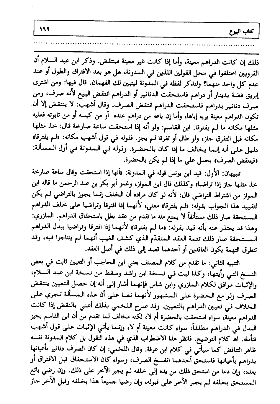 ذَلِكَ إنْ كَانَتْ الدَّرَاهِمُ مُعَيَّنَةً وَأَمَّا إذَا كَانَتْ غَيْرَ مُعَيَّنَةٍ فَيُنْتَقَضُ، وَذَكَرَ ابْنُ عَبْدِ السَّلَامِ أَنَّ الْقَرَوِيِّينَ اخْتَلَفُوا فِي مَحَلِّ الْقَوْلَيْنِ اللَّذَيْنِ فِي الْمُدَوَّنَةِ هَلْ هُوَ بَعْدَ الِافْتِرَاقِ وَالطُّولِ أَوْ عِنْدَ عَدَمِ كُلِّ وَاحِدٍ مِنْهُمَا ؟ وَلْنَذْكُرْ لَفْظَهُ فِي الْمُدَوَّنَةِ لِيَتَبَيَّنَ لَكَ الْفَهْمَانِ قَالَ فِيهَا وَمَنْ اشْتَرَى إبْرِيقَ فِضَّةٍ بِدِينَارٍ أَوْ دَرَاهِمَ فَاسْتُحِقَّتْ الدَّنَانِيرُ أَوْ الدَّرَاهِمُ اُنْتُقِضَ الْبَيْعُ؛ لِأَنَّهُ صَرْفٌ وَمَنْ صَرَفَ دَنَانِيرَ بِدَرَاهِمَ فَاسْتُحِقَّتْ الدَّرَاهِمُ اُنْتُقِضَ الصَّرْفُ، وَقَالَ أَشْهَبُ لَا يُنْتَقَضُ إلَّا أَنْ تَكُونَ الدَّرَاهِمُ مُعَيَّنَةً يُرِيهِ إيَّاهَا وَأَمَّا إنْ بَاعَهُ مِنْ دَرَاهِمَ عِنْدَهُ أَوْ مِنْ كِيسِهِ أَوْ مِنْ تَابُوتِهِ فَعَلَيْهِ مِثْلُهَا مَكَانَهُ مَا لَمْ يَفْتَرِقَا ابْنُ الْقَاسِمِ وَلَوْ أَنَّهُ إذَا اُسْتُحِقَّتْ سَاعَةَ صَارَحَهُ، قَالَ: خُذْ مِثْلَهَا مَكَانَهُ قَبْلَ التَّفَرُّقِ جَازَ وَلَوْ طَالَ أَوْ تَفَرَّقَا لَمْ يَجُزْ فَقَوْلُهُ: فِي قَوْلِ أَشْهَبَ مَكَانَهُ "لَمْ يَفْتَرِقَا" دَلِيلٌ عَلَى أَنَّهُ إنَّمَا يُخَالِفُ مَا إذَا كَانَ بِالْحَضْرَةِ وَقَوْلُهُ فِي الْمُدَوَّنَةِ فِي أَوَّلِ الْمَسْأَلَةِ: فَيُنْتَقَضُ الصَّرْفُ يُحْمَلُ عَلَى مَا إذَا لَمْ يَكُنْ بِالْحَضْرَةِ.