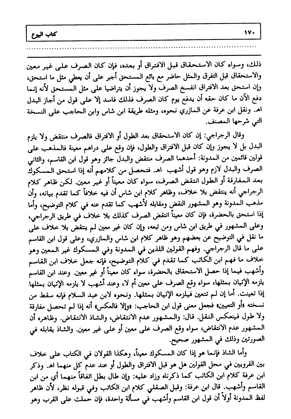 وَأَمَّا الشَّاذُّ، فَإِنَّمَا هُوَ إذَا كَانَ الْمَسْكُوكُ مُعَيَّنًا وَهَكَذَا الْقَوْلَانِ فِي الْكِتَابِ عَلَى خِلَافٍ بَيْنَ الْقَرَوِيِّينَ فِي مَحَلِّ الْقَوْلَيْنِ هَلْ هُوَ قَبْلَ الِافْتِرَاقِ وَالطُّولِ أَوْ عِنْدَ عَدَمِ كُلٍّ مِنْهُمَا ا هـ. وَذَكَرَ ابْنُ عَرَفَةَ كَلَامَ ابْنِ الْكَاتِبِ، كَمَا ذَكَرْنَاهُ وَزَادَ عَلَيْهِ، وَإِنْ طَالَ بَطَلَ اتِّفَاقًا مِنْهُمَا، أَيْ مِنْ ابْنِ الْقَاسِمِ وَأَشْهَبَ قَالَ ابْنُ عَرَفَةَ وَقَبِلَ الصَّقَلِّيُّ كَلَامَ ابْنِ الْكَاتِبِ وَفِي قَبُولِهِ نَظَرٌ؛ لِأَنَّ ظَاهِرَ لَفْظِ الْمُدَوَّنَةِ أَوَّلًا أَنَّ قَوْلَ ابْنِ الْقَاسِمِ وَأَشْهَبَ فِي مَسْأَلَةٍ وَاحِدَةٍ فَإِنْ حَمَلَتْ عَلَى الْقُرْبِ، وَهُوَ