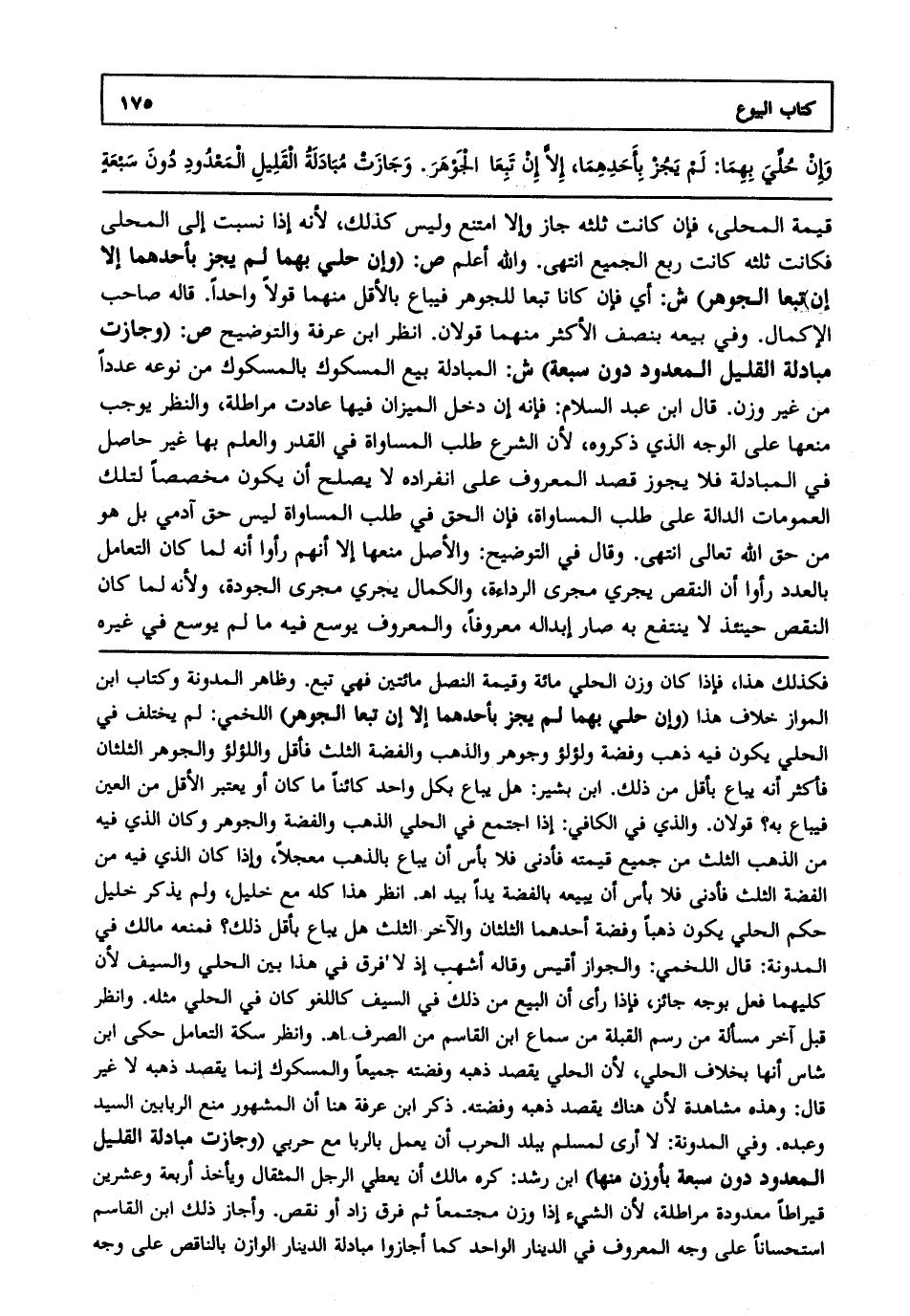 قِيمَةِ الْمُحَلَّى فَإِنْ كَانَتْ ثُلُثَهُ جَازَ وَإِلَّا اُمْتُنِعَ وَلَيْسَ كَذَلِكَ؛ لِأَنَّهُ إذَا نُسِبَتْ إلَى الْمُحَلَّى فَكَانَتْ ثُلُثَهُ كَانَتْ رُبْعَ الْجَمِيعِ انْتَهَى، وَاَللَّهُ أَعْلَمُ. ص: (وَإِنْ حَلَّى بِهِمَا لَمْ يَجُزْ بِأَحَدِهِمَا إلَّا إنْ تَبِعَا الْجَوْهَرَ) ش: أَيْ فَإِنْ كَانَا تَبَعًا لِلْجَوْهَرِ فَيُبَاعُ بِالْأَقَلِّ مِنْهُمَا قَوْلًا وَاحِدًا، قَالَهُ صَاحِبُ الْإِكْمَالِ وَفِي بَيْعِهِ بِنِصْفِ الْأَكْثَرِ مِنْهُمَا قَوْلَانِ اُنْظُرْ ابْنَ عَرَفَةَ وَالتَّوْضِيحَ.ص: (وَجَازَتْ مُبَادَلَةُ الْقَلِيلِ الْمَعْدُودِ دُونَ سَبْعَةٍ) ش: الْمُبَادَلَةُ بَيْعُ الْمَسْكُوكِ بِالْمَسْكُوكِ مِنْ نَوْعِهِ عَدَدًا مِنْ غَيْرِ وَزْنٍ قَالَ ابْنُ عَبْدِ السَّلَامِ: فَإِنَّهُ إنْ دَخَلَ الْمِيزَانُ فِيهَا عَادَتْ مُرَاطَلَةً وَالنَّظَرُ يُوجِبُ مَنْعَهَا عَلَى الْوَجْهِ الَّذِي ذَكَرُوهُ؛ لِأَنَّ الشَّرْعَ طَلَبَ الْمُسَاوَاةَ فِي الْقَدْرِ، وَالْعِلْمُ بِهَا غَيْرُ حَاصِلٍ فِي الْمُبَادَلَةِ فَلَا يَجُوزُ قَصْدُ الْمَعْرُوفِ عَلَى انْفِرَادِهِ لَا يَصْلُحُ أَنْ يَكُونَ مُخَصِّصًا لِتِلْكَ الْعُمُومَاتِ الدَّالَّةِ عَلَى طَلَبِ الْمُسَاوَاةِ فَإِنَّ الْحَقَّ فِي طَلَبِ الْمُسَاوَاةِ لَيْسَ حَقَّ آدَمِيٍّ، بَلْ هُوَ مِنْ حَقِّ اللَّهِ تَعَالَى انْتَهَى، وَقَالَ فِي التَّوْضِيحِ وَالْأَصْلُ مَنْعُهَا إلَّا أَنَّهُمْ رَأَوْا أَنَّهُ لَمَّا كَانَ التَّعَامُلُ بِالْعَدَدِ رَأَوْا أَنَّ النَّقْصَ يَجْرِي مَجْرَى الرَّدَاءَةِ وَالْكَمَالَ يَجْرِي مَجْرَى الْجَوْدَةِ وَلِأَنَّهُ لَمَّا كَانَ النَّقْصُ حِينَئِذٍ لَا يُنْتَفَعُ بِهِ صَارَ إبْدَالُهُ مَعْرُوفًا وَالْمَعْرُوفُ يُوَسَّعُ فِيهِ مَا لَمْ يُوَسَّعْ فِي غَيْرِهِ
