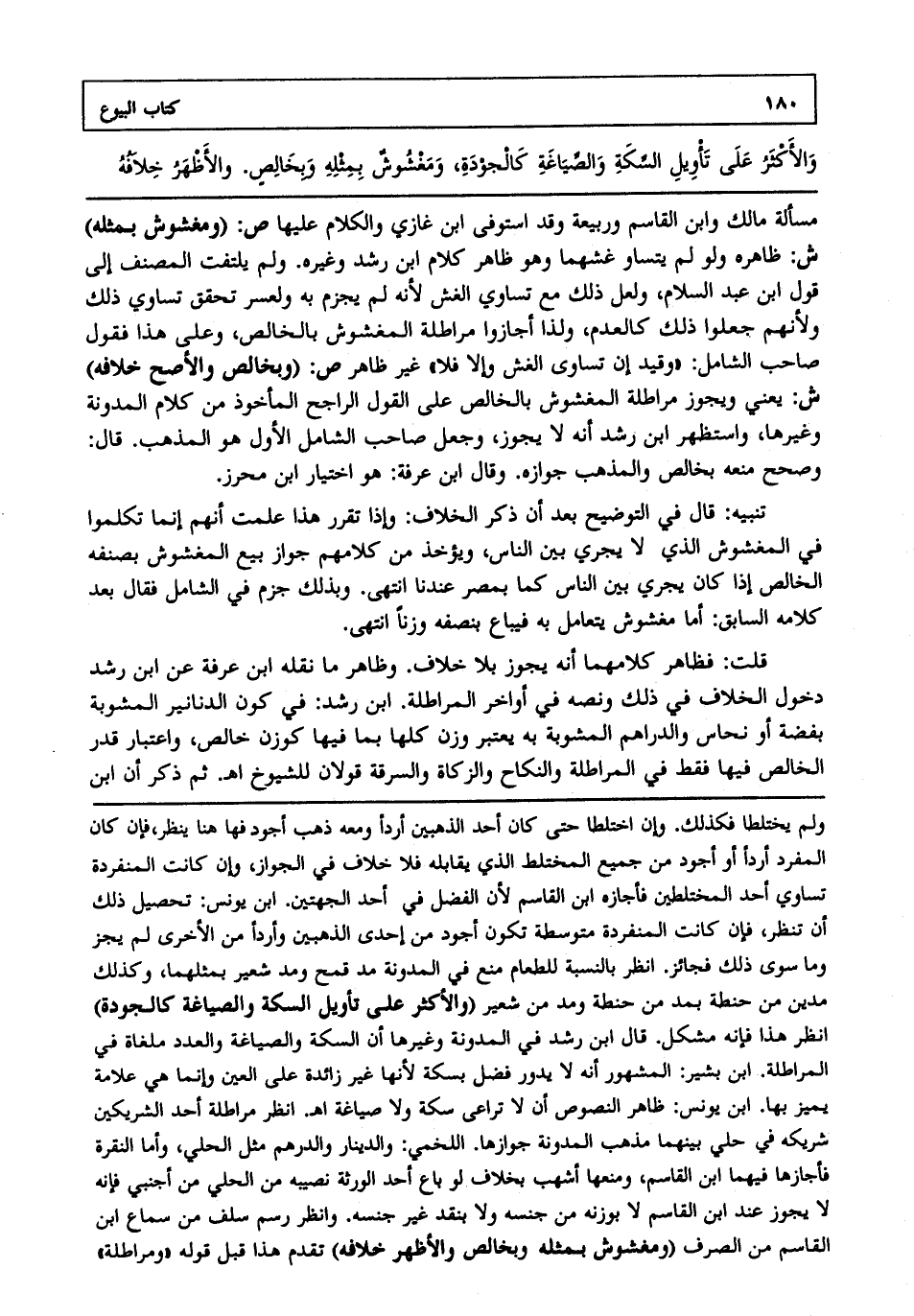 قُلْت: فَظَاهِرُ كَلَامِهِمَا أَنَّهُ يَجُوزُ بِلَا خِلَافٍ، وَظَاهِرُ مَا نَقَلَهُ ابْنُ عَرَفَةَ عَنْ ابْنِ رُشْدٍ دُخُولُ الْخِلَافِ فِي ذَلِكَ، وَنَصَّهُ فِي أَوَاخِرِ الْمُرَاطَلَةِ ابْنُ رُشْدٍ فِي كَوْنِ الدَّنَانِيرِ الْمَشُوبَةِ بِفِضَّةٍ أَوْ نُحَاسٍ، وَالدَّرَاهِمِ الْمَشُوبَةِ بِهِ يُعْتَبَرُ وَزْنُ كُلِّهَا بِمَا فِيهَا كَوَزْنٍ خَالِصٍ وَاعْتِبَارُ قَدْرِ الْخَالِصِ فِيهَا فَقَطْ فِي الْمُرَاطَلَةِ وَالنِّكَاحِ وَالزَّكَاةِ وَالسَّرِقَةِ قَوْلَانِ لِلشُّيُوخِ ا هـ. ثُمَّ ذَكَرَ أَنَّ ابْنَ