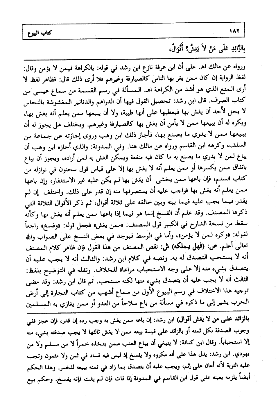 وَرَوَاهُ عَنْ مَالِكٍ ا هـ. عَلَى أَنَّ ابْنَ عَرَفَةَ نَازَعَ ابْنَ رُشْدٍ فِي قَوْلِهِ بِالْكَرَاهَةِ فِيمَنْ لَا يُؤْمَنُ، وَقَالَ: لَفْظُ الرِّوَايَةِ إنْ كَانَ مِمَّنْ يَغُرُّ بِهَا النَّاسَ كَالصَّيَارِفَةِ، وَغَيْرِهِمْ فَلَا أَرَى ذَلِكَ قَالَ: فَظَاهِرُ لَفْظِ لَا أَرَى الْمَنْعُ الَّذِي هُوَ أَشَدُّ مِنْ الْكَرَاهَةِ ا هـ. الْمَسْأَلَةُ فِي رَسْمِ الْقِسْمَةِ مِنْ سَمَاعِ عِيسَى مِنْ كِتَابِ الصَّرْفِ قَالَ ابْنُ رُشْدٍ: تَحْصِيلُ الْقَوْلِ فِيهَا أَنَّ الدَّرَاهِمَ وَالدَّنَانِيرَ الْمَغْشُوشَةَ بِالنُّحَاسِ لَا يَحِلُّ لِأَحَدٍ أَنْ يَغُشَّ بِهَا فَيُعْطِيهَا عَلَى أَنَّهَا طَيِّبَةٌ وَلَا أَنْ يَبِيعَهَا مِمَّنْ يَعْلَمُ أَنَّهُ يَغُشُّ بِهَا وَيُكْرَهُ لَهُ أَنْ يَبِيعَهَا مِمَّنْ لَا يَأْمَنُ أَنْ يَغُشَّ بِهَا كَالصَّيَارِفَةِ وَغَيْرِهِمْ وَيُخْتَلَفُ هَلْ يَجُوزُ لَهُ أَنْ يَبِيعَهَا مِمَّنْ لَا يَدْرِي مَا يَصْنَعُ بِهَا فَأَجَازَ ذَلِكَ ابْنُ وَهْبٍ. وَرَوَى إجَازَتَهُ عَنْ جَمَاعَةٍ مِنْ السَّلَفِ وَكَرِهَهُ ابْنُ الْقَاسِمِ وَرَوَاهُ عَنْ مَالِكٍ هُنَا وَفِي الْمُدَوَّنَةِ وَاَلَّذِي أَجَازَهُ ابْنُ وَهْبٍ أَنْ يُبَاعَ لِمَنْ لَا يَدْرِي مَا يَصْنَعُ بِهِ مَا كَانَ فِيهِ مَنْفَعَةٌ وَيُمْكِنُ الْغِشُّ بِهِ لِمَنْ أَرَادَهُ، وَيَجُوزُ أَنْ يُبَاعَ بِاتِّفَاقٍ مِمَّنْ يَكْسِرُهَا أَوْ مِمَّنْ يَعْلَمُ أَنَّهُ لَا يَغُشُّ بِهَا إلَّا عَلَى قِيَاسِ قَوْلِ سَحْنُونٍ فِي نَوَازِلِهِ مِنْ كِتَابِ السَّلَمِ فَإِنْ بَاعَهَا مِمَّنْ يَخْشَى أَنْ يَغُشَّ بِهَا لَمْ يَكُنْ عَلَيْهِ غَيْرُ الِاسْتِغْفَارِ، وَإِنْ بَاعَهَا مِمَّنْ يَعْلَمُ أَنَّهُ يَغُشُّ بِهَا فَوَاجِبٌ عَلَيْهِ أَنْ يَسْتَصْرِفَهَا مِنْهُ إنْ قَدَرَ عَلَى ذَلِكَ وَاخْتُلِفَ إنْ لَمْ يَقْدِرْ فِيمَا يَجِبُ عَلَيْهِ فِيمَا بَيْنَهُ وَبَيْنَ خَالِقِهِ عَلَى ثَلَاثَةِ أَقْوَالٍ. ثُمَّ ذَكَرَ الْأَقْوَالَ الثَّلَاثَةَ الَّتِي ذَكَرَهَا الْمُصَنِّفُ وَقَدْ عُلِمَ أَنَّ الْفَسْخَ إنَّمَا هُوَ فِيمَا إذَا بَاعَهَا مِمَّنْ يَعْلَمُ أَنَّهُ يَغُشُّ بِهَا وَكَأَنَّهُ سَقَطَ مِنْ نُسْخَةِ الشَّارِحِ فِي الْكَبِيرِ قَوْلُ الْمُصَنِّفِ "مِمَّنْ يَغُشُّ " فَجَعَلَ قَوْلَهُ "وَفَسْخٌ" رَاجِعًا لِقَوْلِهِ "وَكُرِهَ لِمَنْ لَا يُؤْمَنُ" وَأَمَّا فِي الْوَسَطِ فَيُوجَدُ فِي بَعْضِ النُّسَخِ عَلَى الصَّوَابِ، وَاَللَّهُ تَعَالَى أَعْلَمُ. ص: (فَهَلْ يَمْلِكُهُ) ش: نَقَصَ الْمُصَنِّفُ مِنْ هَذَا الْقَوْلِ فَإِنَّ ظَاهِرَ كَلَامِ الْمُصَنِّفِ أَنَّهُ لَا يُسْتَحَبُّ التَّصَدُّقُ لَهُ بِهِ، وَنَصَّهُ فِي كَلَامِ ابْنِ رُشْدٍ وَالثَّالِثُ أَنَّهُ لَا يَجِبُ عَلَيْهِ أَنْ يَتَصَدَّقَ بِشَيْءٍ مِنْهُ إلَّا عَلَى وَجْهِ الِاسْتِحْبَابِ مُرَاعَاةً لِلْخِلَافِ، وَنَقَلَهُ فِي التَّوْضِيحِ بِلَفْظِ "الثَّالِثِ: أَنَّهُ لَا يَجِبُ عَلَيْهِ أَنْ يَتَصَدَّقَ بِشَيْءٍ مِنْهَا لَكِنَّهُ مُسْتَحَبٌّ" ثُمَّ قَالَ ابْنُ رُشْدٍ وَقَدْ مَضَى تَوْجِيهُ هَذَا الِاخْتِلَافِ فِي رَسْمِ الْبُيُوعِ الْأَوَّلِ مِنْ سَمَاعِ أَشْهَبَ مِنْ كِتَابِ التِّجَارَةِ إلَى أَرْضِ الْحَرْبِ يُشِيرُ إلَى مَا ذَكَرَهُ فِي مَسْأَلَةِ مَنْ بَاعَ سِلَاحًا مِنْ الْعَدُوِّ أَوْ مِمَّنْ يُغَازِي بِهِ الْمُسْلِمِينَ