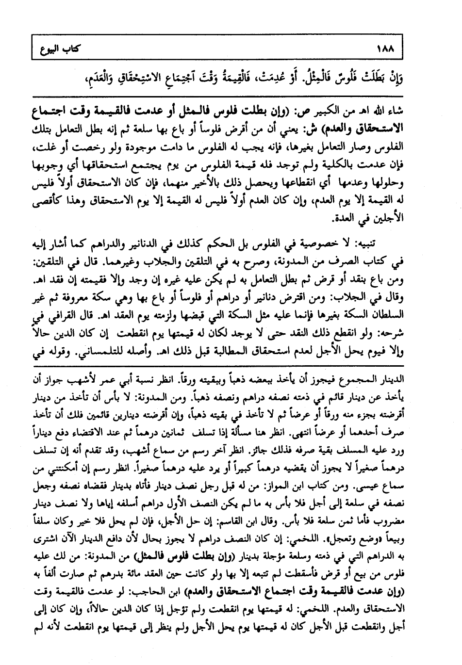 شَاءَ اللَّهُ ا هـ. مِنْ الْكَبِيرِ ص: (وَإِنْ بَطَلَتْ فُلُوسٌ فَالْمِثْلُ أَوْ عَدِمَتْ فَالْقِيمَةُ وَقْتَ اجْتِمَاعِ الِاسْتِحْقَاقِ وَالْعَدَمِ) ش: يَعْنِي أَنَّ مَنْ أَقْرَضَ فُلُوسًا أَوْ بَاعَ بِهَا سِلْعَةً، ثُمَّ إنَّهُ بَطَلَ التَّعَامُلُ بِتِلْكَ الْفُلُوسِ وَصَارَ التَّعَامُلُ بِغَيْرِهَا فَإِنَّهُ يَجِبُ لَهُ الْفُلُوسُ مَا دَامَتْ مَوْجُودَةً وَلَوْ رَخُصَتْ أَوْ غَلَتْ فَإِنْ عَدِمَتْ بِالْكُلِّيَّةِ وَلَمْ تُوجَدْ فَلَهُ قِيمَةُ الْفُلُوسِ مِنْ يَوْمِ يَجْتَمِعُ اسْتِحْقَاقُهَا، أَيْ وُجُوبُهَا وَحُلُولُهَا وَعَدَمُهَا، أَيْ انْقِطَاعُهَا وَيَحْصُلُ ذَلِكَ بِالْأَخِيرِ مِنْهُمَا فَإِنْ كَانَ الِاسْتِحْقَاقُ أَوَّلًا فَلَيْسَ لَهُ الْقِيمَةُ إلَّا يَوْمَ الْعَدَمِ، وَإِنْ كَانَ الْعَدَمُ أَوَّلًا فَلَيْسَ لَهُ الْقِيمَةُ إلَّا يَوْمَ الِاسْتِحْقَاقِ، وَهَذَا كَأَقْصَى الْأَجَلَيْنِ فِي الْعِدَّةِ.