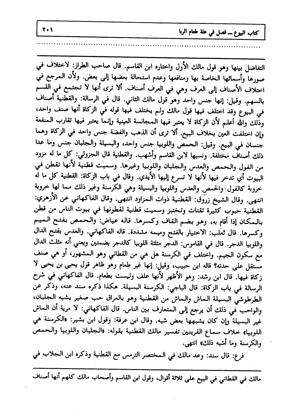 التَّفَاضُلُ بَيْنَهَا، وَهُوَ قَوْلُ مَالِكٍ الْأَوَّلُ وَاخْتَارَهُ ابْنُ الْقَاسِمِ قَالَ صَاحِبُ الطِّرَازِ لِاخْتِلَافِ صُوَرِهَا وَأَسْمَائِهَا الْخَاصَّةِ بِهَا وَمَنَافِعِهَا وَعَدَمِ اسْتِحَالَةِ بَعْضِهَا إلَى بَعْضٍ؛ وَلِأَنَّ الْمَرْجِعَ فِي اخْتِلَافِ الْأَصْنَافِ إلَى الْعُرْفِ، وَهِيَ فِي الْعُرْفِ أَصْنَافٌ أَلَا تَرَى أَنَّهَا لَا تَجْتَمِعُ فِي الْقَسْمِ بِالسَّهْمِ وَقِيلَ: إنَّهَا جِنْسٌ وَاحِدٌ وَهُوَ قَوْلُ مَالِكٍ الثَّانِي قَالَ فِي الرِّسَالَةِ: وَالْقُطْنِيَّةُ أَصْنَافٌ فِي الْبُيُوعِ وَقَدْ اخْتَلَفَ فِيهَا قَوْلُ مَالِكٍ وَلَمْ يَخْتَلِفْ فِيهَا قَوْلُهُ: فِي الزَّكَاةِ إنَّهُ صِنْفٌ وَاحِدٌ وَذَلِكَ، وَاَللَّهُ أَعْلَمُ؛ لِأَنَّ الزَّكَاةَ لَا يُعْتَبَرُ فِيهَا الْمُجَانَسَةُ الْعَيْنِيَّةُ، وَإِنَّمَا يُعْتَبَرُ فِيهَا تَقَارُبُ الْمَنْفَعَةِ، وَإِنْ اخْتَلَفَتْ الْعَيْنُ بِخِلَافِ الْبَيْعِ أَلَا تَرَى أَنَّ الذَّهَبَ وَالْفِضَّةَ جِنْسٌ وَاحِدٌ فِي الزَّكَاةِ، وَهُمَا جِنْسَانِ فِي الْبَيْعِ، وَقِيلَ الْحِمَّصُ وَاللُّوبِيَا جِنْسٌ وَاحِدٌ وَالْبِسِلَّةُ وَالْجُلُبَّانُ جِنْسٌ وَمَا عَدَا ذَلِكَ أَصْنَافٌ مُخْتَلِفَةٌ، وَنَسَبَهَا لِابْنِ الْقَاسِمِ وَأَشْهَبَ، وَالْقُطْنِيَّةُ قَالَ الْجُزُولِيُّ كُلُّ مَا لَهُ مُزَوَّدٌ مِنْ الْفُولِ وَالْحِمَّصِ وَالْعَدَسِ وَالْجُلُبَّانِ وَاللُّوبِيَا وَغَيْرِهَا وَسُمِّيَتْ قُطْنِيَّةً؛ لِأَنَّهَا تَقْطُنُ فِي الْبُيُوتِ، أَيْ تُدَّخَرُ فِيهَا؛ لِأَنَّهَا لَا تُسْرِعُ إلَيْهَا الْأَيْدِي. وَقَالَ فِي بَابِ الزَّكَاةِ الْقُطْنِيَّةُ: كُلُّ مَا لَهُ خَرُّوبَةٌ كَالْفُولِ، وَالْحِمَّصِ وَالْعَدَسِ وَاللُّوبِيَا وَالْبَسِيلَةِ وَهِيَ الْكِرْسِنَّةُ وَغَيْرِ ذَلِكَ مِمَّا لَهَا خَرُّوبَةٌ انْتَهَى، وَقَالَ الشَّيْخُ زَرُّوقٌ الْقُطْنِيَّةُ ذَوَاتُ الْمَزَاوِدِ انْتَهَى. قَالَ الْفَاكِهَانِيُّ عَنْ الْأَزْهَرِيِّ: الْقُطْنِيَّةُ حُبُوبٌ كَثِيرَةٌ تُقْتَاتُ وَتُخْتَبَزُ وَسُمِّيَتْ قُطْنِيَّةً لِقُطُونِهَا فِي بُيُوتِ النَّاسِ مِنْ قَطَنَ بِالْمَكَانِ إذَا أَقَامَ بِهِ، وَهُوَ بِضَمِّ الْقَافِ وَكَسْرِهَا، قَالَهُ عِيَاضٌ، وَالْحِمَّصُ بِفَتْحِ الْمِيمِ وَكَسْرِهَا قَالَ ثَعْلَبٌ الِاخْتِيَارُ الْفَتْحُ وَمِيمُهُ مُشَدَّدَةٌ، قَالَهُ الْفَاكِهَانِيُّ وَالْعَدَسُ بِفَتْحِ الدَّالِ، وَاللُّوبِيَا الدَّجْرُ قَالَ فِي الْقَامُوسِ: الدَّجْرُ مُثَلَّثَةٌ اللُّوبِيَا كَالدُّجُرِ بِضَمَّتَيْنِ، وَيَعْنِي أَنَّهُ مُثَلَّثُ الدَّالِ مَعَ سُكُونِ الْجِيمِ، وَاخْتُلِفَ فِي الْكِرْسِنَّةِ هَلْ هِيَ مِنْ الْقَطَانِيِّ، وَهُوَ الْمَشْهُورُ أَوْ هِيَ صِنْفٌ مُسْتَقِلٌّ عَلَى حِدَتِهِ، قَالَهُ ابْنُ حَبِيبٍ وَقِيلَ: إنَّهَا غَيْرُ طَعَامٍ، وَهُوَ ظَاهِرُ قَوْلِ يَحْيَى بْنِ يَحْيَى لَا زَكَاةَ فِيهَا قَالَ ابْنُ رُشْدٍ، وَهُوَ الْأَظْهَرُ؛ لِأَنَّهَا عَلَفٌ، وَلَيْسَتْ بِطَعَامٍ قَالَ الْفَاكِهَانِيُّ فِي شَرْحِ الرِّسَالَةِ فِي بَابِ الزَّكَاةِ قَالَ الْبَاجِيُّ: الْكِرْسِنَّةُ الْبَسِيلَةُ هَكَذَا ذَكَرَهُ سَنَدٌ عَنْهُ، وَذَكَرَ عَنْ الطُّرْطُوشِيِّ الْبَسِيلَةُ الْمَاشُّ، وَالْمَاشُّ مِنْ الْقُطْنِيَّةِ، وَهُوَ بِالْعِرَاقِ حَبٌّ صَغِيرٌ يُشْبِهُ الْجُلُبَّانَ، وَالْوَاجِبُ فِي ذَلِكَ أَنْ يَرْجِعَ إلَى الْمُتَعَارَفِ بَيْنَ النَّاسِ، قَالَ الْفَاكِهَانِيُّ لَا مِرْيَةَ أَنَّ الْمَاشَّ غَيْرُ الْبَسِيلَةِ، وَإِنْ كَانَ يُشْبِهُهَا بَعْضَ شَبَهٍ، وَقَالَ ابْنُ عَرَفَةَ وَقَوْلُ ابْنِ بَشِيرٍ "الْكِرْسِنَّةُ هِيَ اللُّوبِيَا" خِلَافُ سَمَاعِ الْقَرِينَيْنِ تَفْسِيرُ مَا