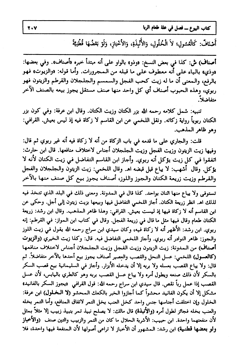 قُلْت: وَالْجَارِي عَلَى مَا قَدَّمَهُ فِي بَابِ الزَّكَاةِ مِنْ أَنَّهُ لَا زَكَاةَ فِيهِ أَنَّهُ غَيْرُ رِبَوِيٍّ ثُمَّ قَالَ وَفِيهَا زَيْتُ الزَّيْتُونِ وَزَيْتُ الْفُجْلِ وَزَيْتُ الْجُلْجُلَانِ أَجْنَاسٌ لِاخْتِلَافِ مَنَافِعِهَا قَالَ ابْنُ حَارِثٍ اتَّفَقُوا فِي كُلِّ زَيْتٍ يُؤْكَلُ أَنَّهُ رِبَوِيٌّ وَأَجَازَ ابْنُ الْقَاسِمِ التَّفَاضُلَ فِي زَيْتِ الْكَتَّانِ لِأَنَّهُ لَا يُؤْكَلُ وَقَالَ أَشْهَبُ لَا يُبَاعُ قَبْلَ قَبْضِهِ ا هـ وَقَالَ اللَّخْمِيُّ زَيْتُ الزَّيْتُونِ وَالْجُلْجُلَانِ وَالْفُجْلِ وَالْقُرْطُمِ وَزَيْتُ زَرِيعَةِ الْكَتَّانِ وَالْجَوْزُ وَاللَّوْزُ أَصْنَافٌ يَجُوزُ بَيْعُ كُلِّ صِنْفٍ مِنْهَا بِالْآخَرِ