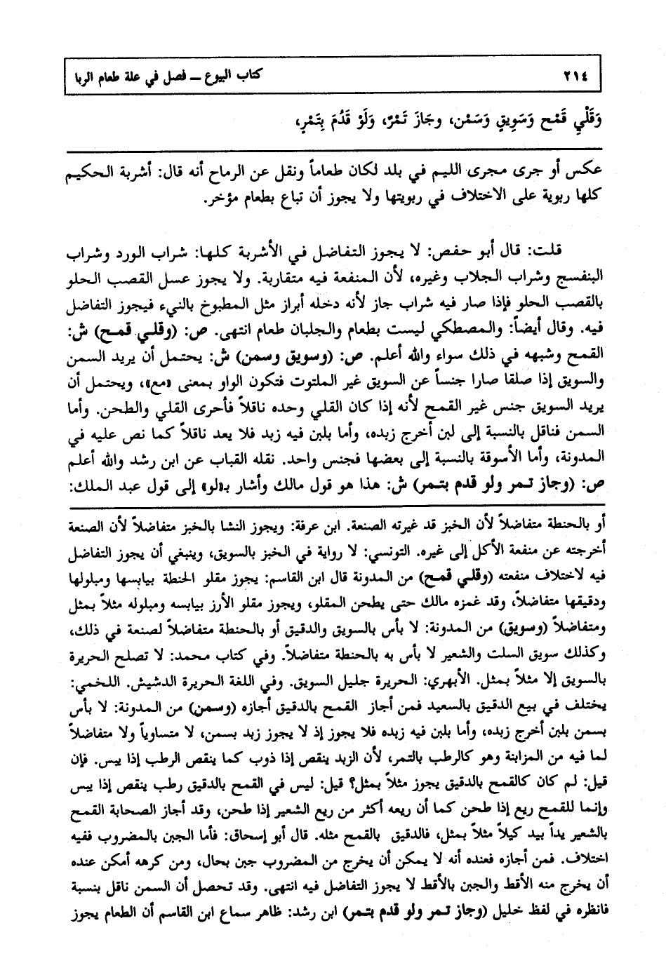 قلت: قال أبو حفص: لا يجوز التفاضل في الأشربة كلها شراب الورد وشراب البنفسج وشراب الجلاب وغيره لأن المنفعة فيه متقاربة ولا يجوز عسل القصب الحلو بالقصب الحلو فإذا صار فيه شراب جاز لأنه دخله أبزار مثل المطبوخ بالنيء فيجوز التفاضل فيه، وقال أيضا: والمصطكى ليست بطعام والجلبان طعام، انتهى ص: (وقلي قمح) ش: القمح وشبهه في ذلك سواء، والله أعلم. ص: (وسويق وسمن) ش: يحتمل أن يريد السمن والسويق إذا صلقا صارا جنسا عن السويق غير الملتوت فتكون الواو بمعنى "مع" ويحتمل أن يريد: السويق جنس غير القمح؛ لأنه إذا كان القلي وحده ناقلا فأحرى القلي والطحن وأما السمن فناقل بالنسبة إلى لبن أخرج زبده وإما بلبن فيه زبد فلا يعد ناقلا كما نص عليه في المدونة وأما الأسوقة بالنسبة إلى بعضها فجنس واحد نقله القباب عن ابن رشد، والله أعلم.ص: (وجاز تمر ولو قدم بتمر) ش: هذا هو قول مالك وأشار بـ"لو" إلى قول عبد الملك: