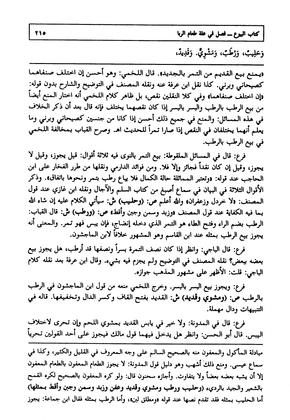 "يمنع بيع القديم من التمر بالجديد".قال اللخمي: وهو أحسن إن اختلف صنفاهما كصيحاني وبرني، كذا نقل ابن عرفة عنه ونقله المصنف في التوضيح والشارح بدون قوله "إن اختلف صنفاهما" وفي كلا النقلين نقص بل ظاهر كلام اللخمي أنه اختار المنع أيضا من بيع الرطب بالرطب والبسر بالبسر إذا كان نقصهما يختلف فإنه قال بعد أن ذكر الخلاف في هذه المسائل: والمنع في جميع ذلك أحسن إذا كانا من جنسين كصيحاني وبرني وما يعلم أنهما يختلفان في النقص إذا صارا تمرا للحديث ا هـ وصرح القباب بمخالفة اللخمي في بيع الرطب بالرطب.