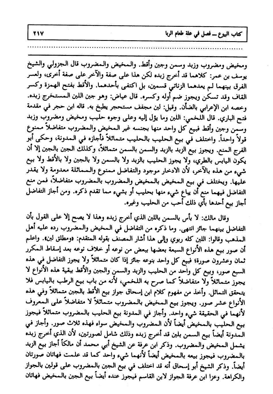 ومخيض ومضروب وزبد وسمن وجبن وأقط والمخيض والمضروب قال الجزولي والشيخ يوسف بن عمر كلاهما قد أخرج زبده لكن هذا على صفة والآخر على صفة أخرى ولعسر الفرق بينهما لم يعدهما الزناتي قسمين بل اكتفى بأحدهما والأقط بفتح الهمزة وكسر القاف وقد تسكن ويجوز ضم أوله وكسره قال عياض وهو جبن اللبن المستخرج زبده وخصه ابن الأعرابي بالضأن وقيل لبن مجفف مستحجر يطبخ به، قاله ابن حجر في مقدمة فتح الباري قال اللخمي اللبن وما يئول إليه على وجوه حليب ومخيض ومضروب وزبد وسمن وجبن وأقط فبيع كل واحد منها بجنسه غير المخيض والمضروب متفاضلا ممنوع قولا واحدا واختلف في بيع الحليب بالحليب متماثلا فأجازه في المدونة. وحكى أبو الفرج المنع ويجوز بيع الزبد بالزبد والسمن بالسمن متماثلا وكذلك الجبن بالجبن إلا أن يكون اليابس بالطري ولا يجوز الحليب بالزبد ولا بالسمن ولا بالجبن ولا بالأقط ولا بيع شيء من هذه بالآخر؛ لأن الادخار موجود والتفاضل ممنوع والمماثلة معدومة ولا يقدر عليها ويختلف في بيع المخيض بالمخيض والمضروب بالمضروب متفاضلا فمن منع التفاضل فيهما منع أن يباع شيء منها بحليب أو بشيء مما تقدم ذكره ومن أجاز التفاضل أجاز بيع أحدها بأي ذلك أحب من الحليب وغيره.