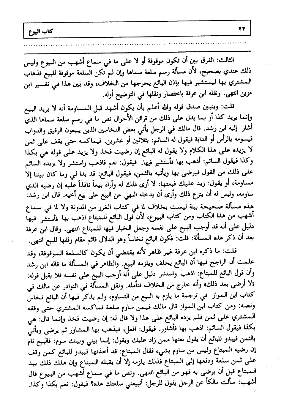 قلت: ما ذكره ابن عرفة غير ظاهر؛ لأنه يقتضي أن يكون كالسلعة الموقوفة، وقد علمت أن الراجح فيها أن البائع يحلف ويلزمه البيع، والظاهر في المسألة ما قاله ابن رشد وأن قول البائع للمبتاع: اذهب واستشر دليل على أنه أوجب البيع على نفسه، فلا يقبل قوله: أرضى بعد ذلك، وأنه خارج من الخلاف فتأمله، ونقل المسألة في النوادر عن مالك في كتاب ابن المواز في ترجمة ما يلزم به البيع من التساوم ولم يذكر فيها أن البائع نخاس، ونصه من كتاب ابن المواز قال مالك فيمن ساوم سلعة فماكسه المشتري حتى وقفه المشتري على ثمن فلم يزده البائع على هذا ولا قال له: إن رضيت فخذ، وإنما قال: هي بكذا فيقول السائم: أذهب بها فأشاور فيقول: افعل فيذهب بها المشاور ثم يرضى ويأتي بالثمن فيبدو للبائع أن يقول بعتها ممن زاد عليك، ويقول: إنما بيني وبينك سوم فالبيع تام إن رضيه المبتاع وليس من ساوم بشيء فقال المبتاع: قد أخذتها فيبدو للبائع كمن وقف على ثمن سلعة ودفعها إلى المبتاع فذلك يلزمه إلا أن يقبله المبتاع، وإن هلك ذلك بيد المبتاع قبل أن يرضى به فهو من البائع، انتهى. ونص ما في سماع أشهب من البيوع قال أشهب سألت مالكا عن الرجل يقول للرجل: أتبيعني سلعتك هذه؟ فيقول: نعم بكذا وكذا.