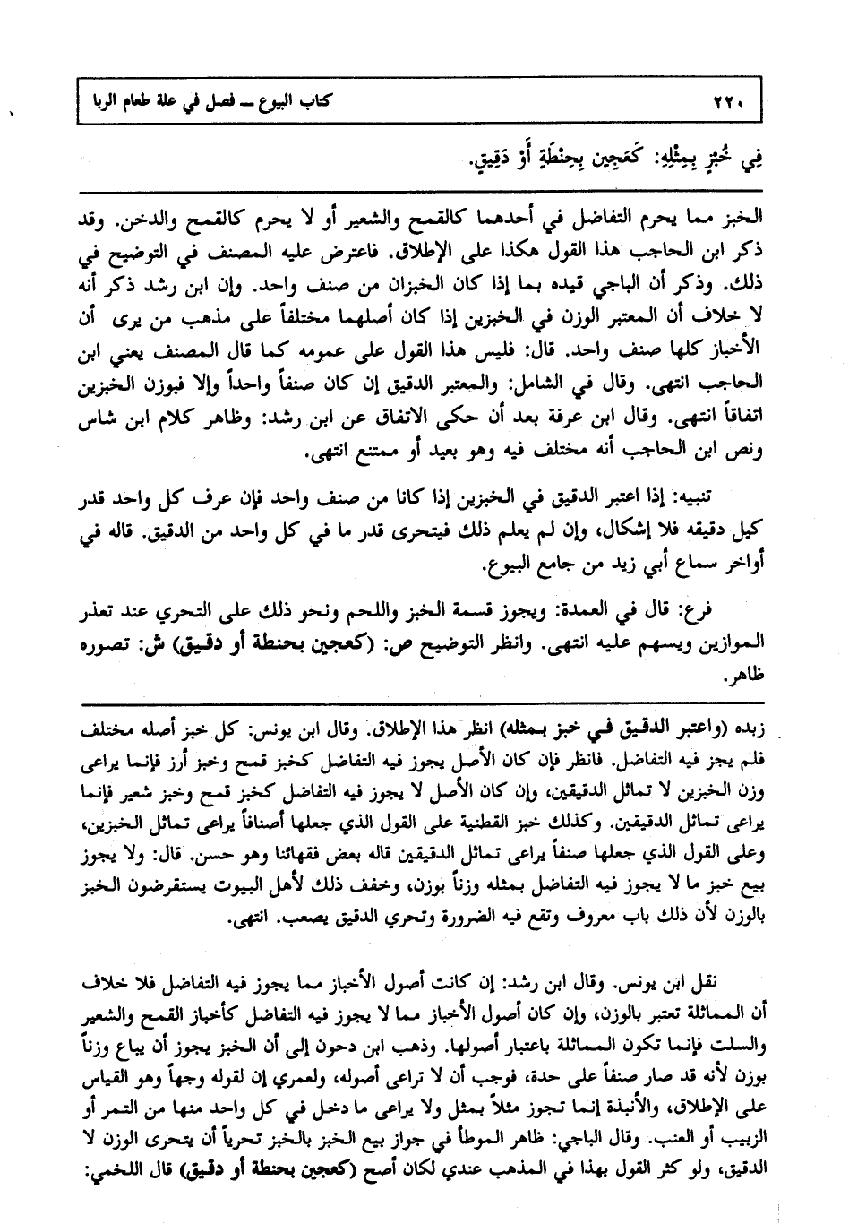 الخبز مما يحرم التفاضل في أحدهما كالقمح والشعير أو لا يحرم كالقمح والدخن وقد ذكر ابن الحاجب هذا القول، هكذا على الإطلاق فاعترض عليه المصنف في التوضيح في ذلك وذكر أن الباجي قيده بما إذا كان الخبزان من صنف واحد وأن ابن رشد ذكر أنه لا خلاف أن المعتبر الوزن في الخبزين إذا كان أصلهما مختلفا على مذهب من يرى أن الأخباز كلها صنف واحد قال: فليس هذا القول على عمومه كما قال المصنف يعني ابن الحاجب، انتهى. وقال في الشامل: والمعتبر الدقيق إن كان صنفا واحدا وإلا فبوزن الخبزين اتفاقا، انتهى. وقال ابن عرفة بعد أن حكى الاتفاق عن ابن رشد: وظاهر كلام ابن شاس ونص ابن الحاجب أنه مختلف فيه وهو بعيد أو ممتنع، انتهى.