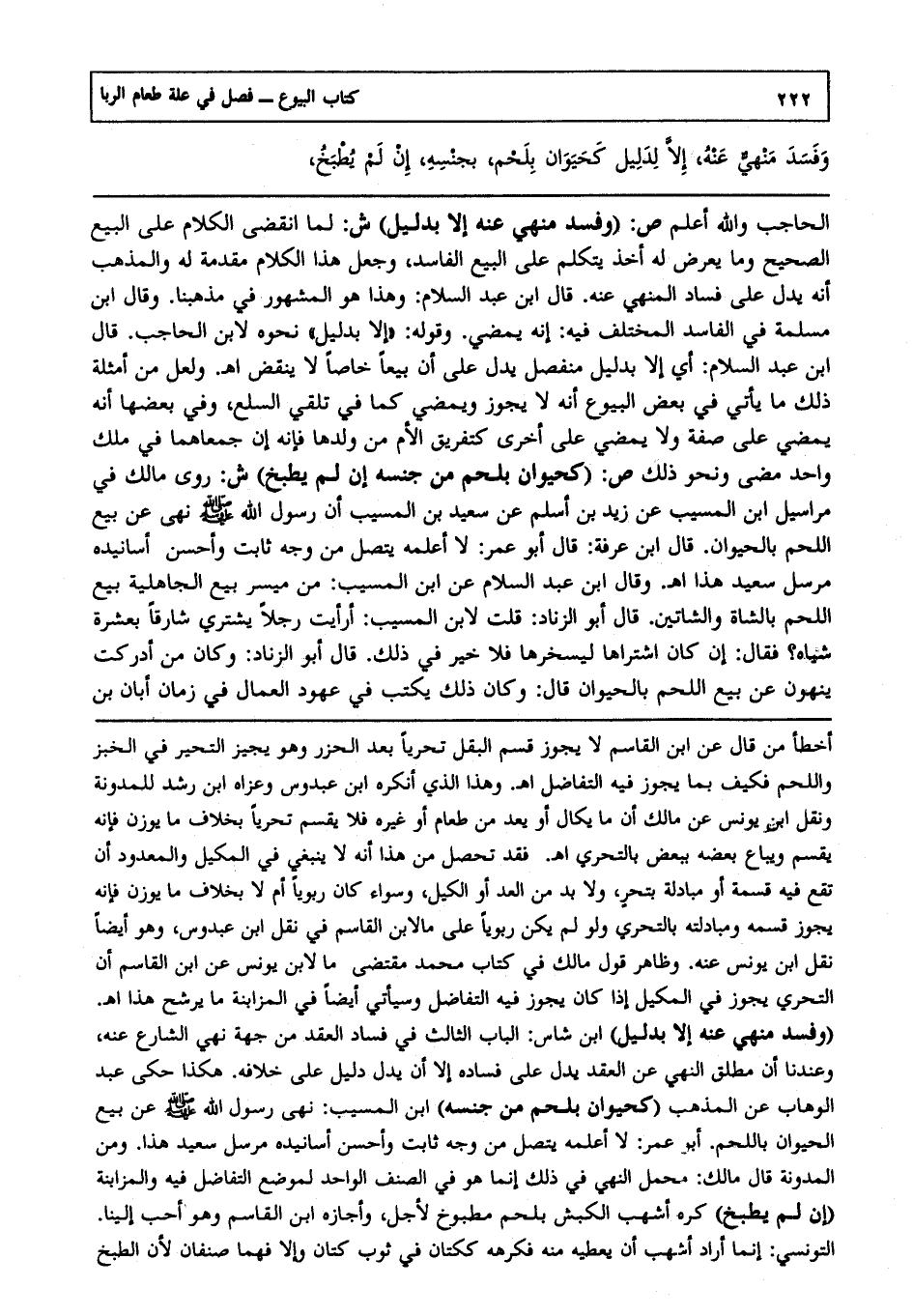 الحاجب، والله أعلم.ص: (وفسد منهي عنه إلا بدليل) ش: لما انقضى الكلام على البيع الصحيح وما يعرض له أخذ يتكلم على البيع الفاسد وجعل هذا الكلام مقدمة له والمذهب أنه يدل على فساد المنهي عنه قال ابن عبد السلام: وهذا هو المشهور في مذهبنا، وقال ابن مسلمة في الفاسد المختلف فيه إنه يمضي وقوله إلا بدليل نحوه لابن الحاجب قال ابن عبد السلام: أي إلا بدليل منفصل يدل على أن بيعا خاصا لا ينقض ا هـ. ولعل من أمثلة ذلك ما يأتي في بعض البيوع أنه لا يجوز ويمضي كما في تلقي السلع وفي بعضها أنه يمضي على صفة ولا يمضي على أخرى كتفريق الأم من ولدها فإنه إن جمعاهما في ملك واحد مضى ونحو ذلك ص: (كحيوان بلحم من جنسه إن لم يطبخ) ش: روى مالك في مراسيل ابن المسيب عن زيد بن أسلم عن سعيد بن المسيب أن رسول الله صلى الله عليه وسلم "نهى عن بيع اللحم بالحيوان" قال ابن عرفة، قال أبو عمر: لا أعلمه يتصل من وجه ثابت وأحسن أسانيده مرسل سعيد هذا ا هـ. وقال ابن عبد السلام عن ابن المسيب من ميسر بيع الجاهلية: بيع اللحم بالشاة والشاتين قال أبو الزناد: قلت لابن المسيب: "أرأيت رجلا يشتري شارفا بعشرة شياه، فقال: إن كان اشتراها ليسخرها فلا خير في ذلك" قال أبو الزناد: وكان من أدركت ينهون عن بيع اللحم بالحيوان، قال: وكان ذلك يكتب في عهود العمال في زمان أبان بن