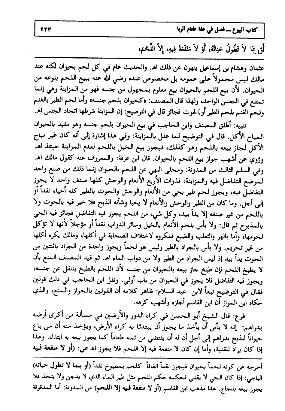 عثمان وهشام بن إسماعيل ينهون عن ذلك ا هـ. والحديث عام في كل لحم بحيوان لكنه عند مالك ليس محمولا على عمومه بل مخصوص عنده رضي الله عنه ببيع اللحم بنوعه من الحيوان؛ لأن بيع اللحم بالحيوان بيع معلوم بمجهول من جنسه فهو من المزابنة وهي إنما تمتنع في الجنس الواحد؛ ولهذا قال المصنف: كحيوان بلحم جنسه وأما لحم الطير بالغنم ولحم الغنم بلحم الطير أو الحوت فجائز قال في التوضيح: إن المزابنة شرطها اتحاد الجنس ا هـ.