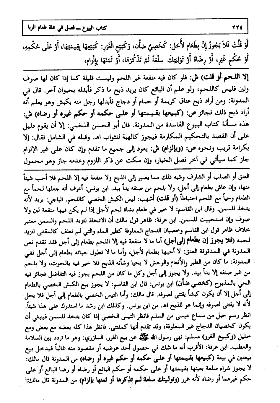 إلا اللحم أو قلت) ش: فلو كان فيه منفعة غير اللحم وليست قليلة كما إذا كان لها صوف ولبن فليس كاللحم ولو علم أن البائع كان يريد ذبح ما ذكر فأبدله بحيوان آخر، قال في المدونة: ومن أراد ذبح عناق كريمة أو حمام أو دجاج فأبدلها رجل منه بكبش وهو يعلم أنه أراد ذبح ذلك فجائز ص: (كبيعها بقيمتها أو على حكمه أو حكم غيره أو رضاه) ش: هذه مسألة: كتاب البيوع الفاسدة من المدونة قال أبو الحسن اللخمي: إلا أن يقوم دليل على أن القصد بالتحكيم المكارمة فيجوز كالهبة للثواب ا هـ. وقبله في الشامل، فقال: إلا بكرامة قريب ونحوه ص: (بإلزام) ش: يعود إلى جميع ما تقدم وإن كان على غير الإلزام جاز كما سيأتي في آخر فصل الخيار وإن سكت عن ذكر اللزوم وعدمه جاز وهو محمول