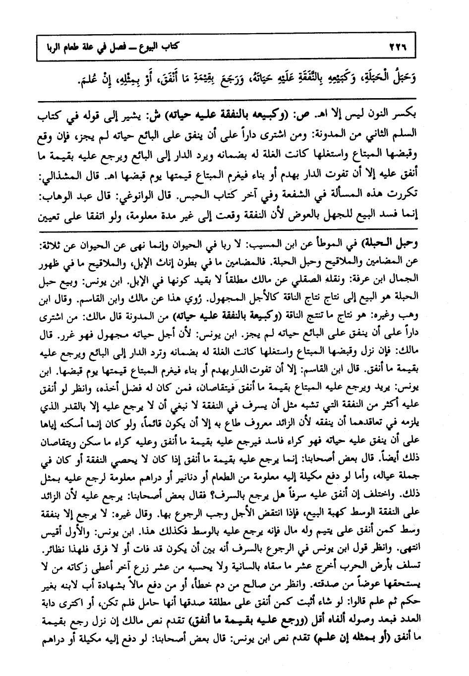 وحبل الحبلة, وكبيعه بالنفقة عليه حياته, ورجع بقيمة ما أنفق, أو بمثله, إن علم.
