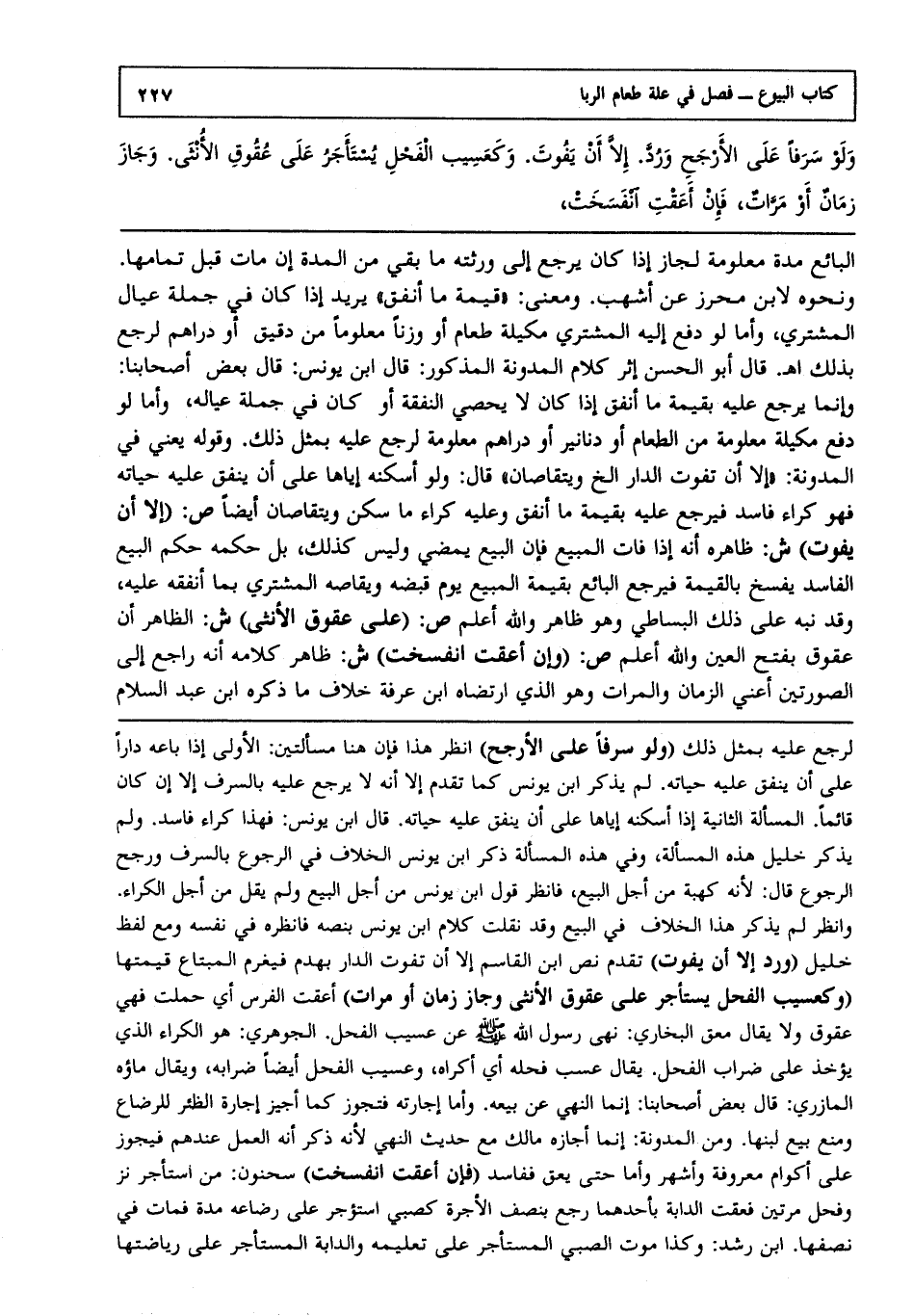 البائع مدة معلومة لجاز إذا كان يرجع إلى ورثته ما بقي من المدة إن مات قبل تمامها، ونحوه لابن محرز عن أشهب ومعنى: "قيمة ما أنفق" يريد إذا كان في جملة عيال المشتري وأما لو دفع إليه المشتري مكيلة طعام أو وزنا معلوما من دقيق أو دراهم لرجع بذلك ا هـ. قال أبو الحسن إثر كلام المدونة المذكور، قال ابن يونس قال بعض أصحابنا: وإنما يرجع عليه بقيمة ما أنفق إذا كان لا يحصي النفقة أو كان في جملة عياله وأما لو دفع مكيلة معلومة من الطعام أو دنانير أو دراهم معلومة لرجع عليه بمثل ذلك وقوله يعني في المدونة "إلا أن تفوت الدار إلخ ويتقاصان" قال: ولو أسكنه إياها على أن ينفق عليه حياته فهو كراء فاسد فيرجع عليه بقيمة ما أنفق وعليه كراء ما سكن ويتقاصان أيضا ص: (إلا أن يفوت) ش: ظاهره أنه إذا فات المبيع فإن البيع يمضي وليس كذلك بل حكمه حكم البيع الفاسد يفسخ بالقيمة فيرجع البائع بقيمة المبيع يوم قبضه ويقاصه المشتري بما أنفقه عليه وقد نبه على ذلك البساطي وهو ظاهر، والله أعلم.ص: (على عقوق الأنثى) ش: الظاهر أن عقوق بفتح العين، والله أعلم. ص: (وإن أعقت انفسخت) ش: ظاهر كلامه أنه راجع إلى الصورتين أعني الزمان والمرات وهو الذي ارتضاه ابن عرفة خلاف ما ذكره ابن عبد السلام