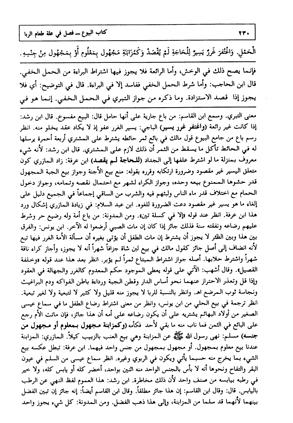 الحمل. واغتفر غرر يسير للحاجة لم يقصد وكمزابنة مجهول بمعلوم أو بمجهول من جنسه.