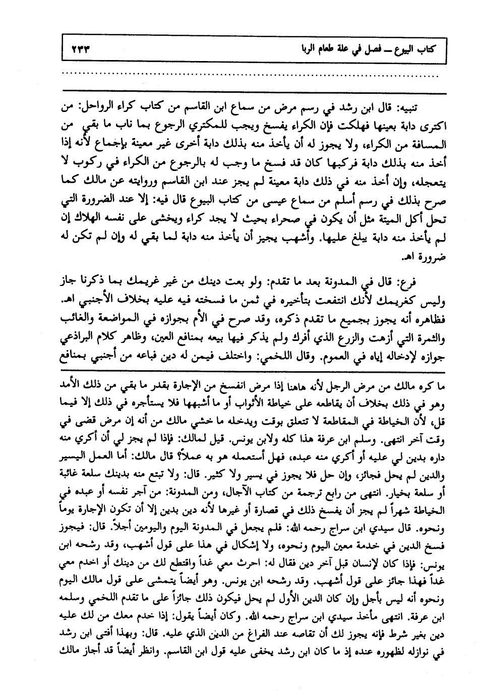تنبيه: قال ابن رشد في رسم مرض من سماع ابن القاسم من كتاب كراء الرواحل: من اكترى دابة بعينها فهلكت فإن الكراء يفسخ ويجب للمكتري الرجوع بما ناب ما بقي من المسافة من الكراء ولا يجوز له أن يأخذ منه بذلك دابة أخرى غير معينة بإجماع؛ لأنه إذا أخذ منه بذلك دابة فركبها كان قد فسخ ما وجب له بالرجوع من الكراء في ركوب لا يتعجله وإن أخذ منه في ذلك دابة معينة لم يجز عند ابن القاسم وروايته عن مالك كما صرح بذلك في رسم أسلم من سماع عيسى من كتاب البيوع قال فيه إلا عند الضرورة التي تحل أكل الميتة مثل أن يكون في صحراء بحيث لا يجد كراء ويخشى على نفسه الهلاك إن لم يأخذ منه دابة يبلغ عليها وأشهب يجيز أن يأخذ منه دابة لما بقي له وإن لم تكن له ضرورةا هـ. فرع: قال في المدونة بعد ما تقدم: ولو بعت دينك من غير غريمك بما ذكرنا جاز وليس كغريمك؛ لأنك انتفعت بتأخيره في ثمن ما فسخته فيه عليه بخلاف الأجنبي ا هـ. فظاهره أنه يجوز بجميع ما تقدم ذكره وقد صرح في الأم بجوازه في المواضعة والغائب والثمرة التي أزهت والزرع الذي أفرك ولم يذكر فيها بيعه بمنافع العين وظاهر كلام البراذعي جوازه لإدخاله إياه في العموم وقال اللخمي: واختلف فيمن له دين فباعه من أجنبي بمنافع