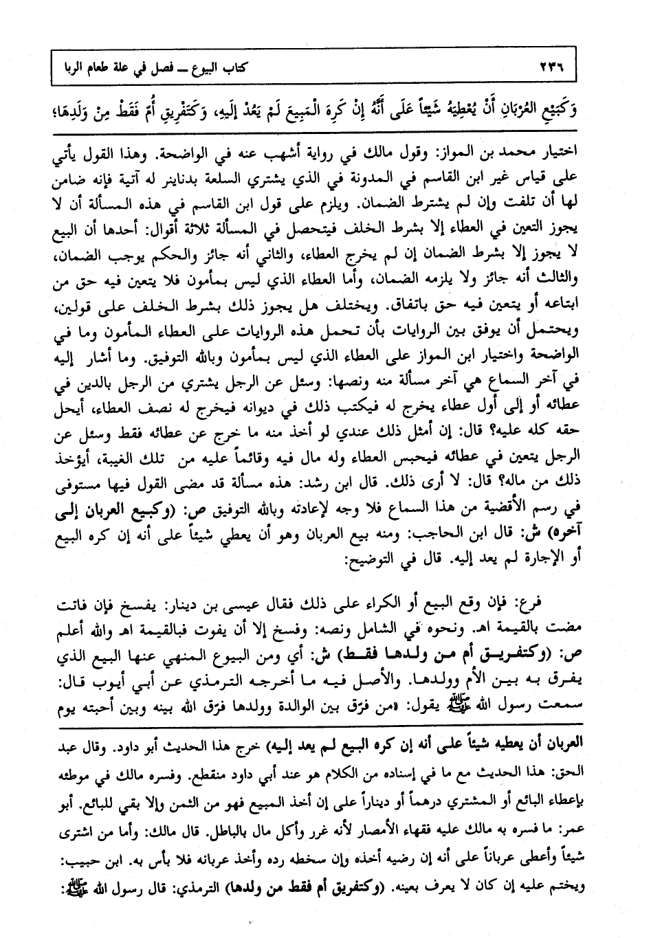 اختيار محمد بن المواز وقول مالك في رواية أشهب عنه في الواضحة وهذا القول يأتي على قياس غير ابن القاسم في المدونة في الذي يشتري السلعة بدنانير له آتية فإنه ضامن لها إن تلفت وإن لم يشترط الضمان ويلزم على قول ابن القاسم في هذه المسألة أن لا يجوز التعين في العطاء إلا بشرط الخلف فيتحصل في المسألة ثلاثة أقوال: أحدها: أن البيع لا يجوز إلا بشرط الضمان إن لم يخرج العطاء والثاني أنه جائز والحكم يوجب الضمان والثالث أنه جائز ولا يلزمه الضمان وأما العطاء الذي ليس بمأمون فلا يتعين فيه حق من ابتاعه أو يتعين فيه حق باتفاق ويختلف هل يجوز ذلك بشرط الخلف على قولين ويحتمل أن يوفق بين الروايات بأن تحمل هذه الروايات على العطاء المأمون وما في الواضحة واختيار ابن المواز على العطاء الذي ليس بمأمون، وبالله التوفيق. وما أشار إليه في آخر السماع هي آخر مسألة منه ونصها: وسئل عن الرجل يشتري من الرجل بالدين في عطائه أو إلى أول عطاء يخرج له فيكتب ذلك في ديوانه فيخرج له نصف العطاء أيحل حقه كله عليه قال: إن أمثل ذلك عندي لو أخذ منه ما خرج عن عطائه فقط، وسئل عن الرجل يتعين في عطائه فيحبس العطاء وله مال فيه وقائما عليه من تلك الغيبة أيؤخذ ذلك من ماله قال: لا أرى ذلك قال ابن رشد: هذه مسألة قد مضى القول فيها مستوفى في رسم الأقضية من هذا السماع فلا وجه لإعادته، وبالله التوفيق.ص: (وكبيع العربان إلى آخره) ش: قال ابن الحاجب: ومنه بيع العربان وهو أن يعطي شيئا على أنه إن كره البيع أو الإجارة لم يعد إليه قال في التوضيح: