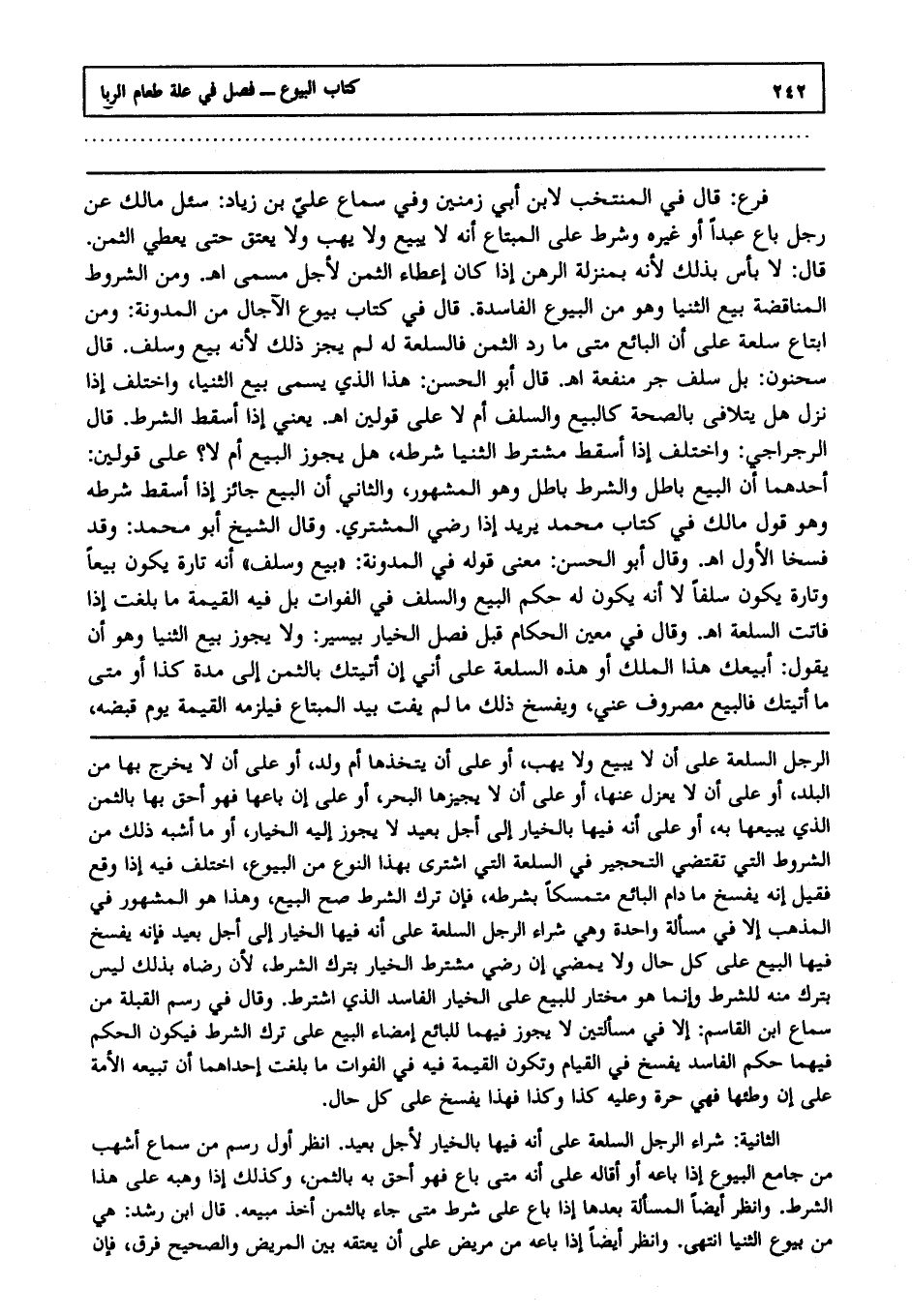 فرع: قال في المنتخب لابن أبي زمنين وفي سماع علي بن زياد: سئل مالك عن رجل باع عبدا أو غيره وشرط على المبتاع أنه لا يبيع ولا يهب ولا يعتق حتى يعطي الثمن قال: لا بأس بذلك؛ لأنه بمنزلة الرهن إذا كان إعطاء الثمن لأجل مسمى ا هـ. ومن الشروط المناقضة بيع الثنيا وهو من البيوع الفاسدة قال في كتاب بيوع الآجال من المدونة: ومن ابتاع سلعة على أن البائع متى ما رد الثمن فالسلعة له لم يجز ذلك؛ لأنه بيع وسلف قال سحنون بل سلف جر منفعة ا هـ. قال أبو الحسن هذا الذي يسمى بيع الثنيا واختلف إذا نزل هل يتلافى بالصحة كالبيع والسلف أو لا على قولين ا هـ. يعني إذا أسقط الشرط قال الرجراجي واختلف إذا أسقط مشترط الثنيا شرطه هل يجوز البيع أم لا على قولين، أحدهما أن البيع باطل والشرط باطل وهو المشهور، والثاني أن البيع جائز إذا أسقط شرطه وهو قول مالك في كتاب محمد يريد إذا رضي المشتري وقال الشيخ أبو محمد وقد فسخا الأول ا هـ. وقال أبو الحسن معنى قوله في المدونة "بيع وسلف" أنه تارة يكون بيعا وتارة يكون سلفا لا أنه يكون له حكم البيع والسلف في الفوات بل فيه القيمة ما بلغت إذا فاتت السلعة ا هـ. وقال في معين الحكام قبل فصل الخيار بيسير ولا يجوز بيع الثنيا وهو أن يقول أبيعك هذا الملك أو هذه السلعة على أني إن أتيتك بالثمن إلى مدة كذا أو متى ما أتيتك فالبيع مصروف عني ويفسخ ذلك ما لم يفت بيد المبتاع فيلزمه القيمة يوم قبضه ,