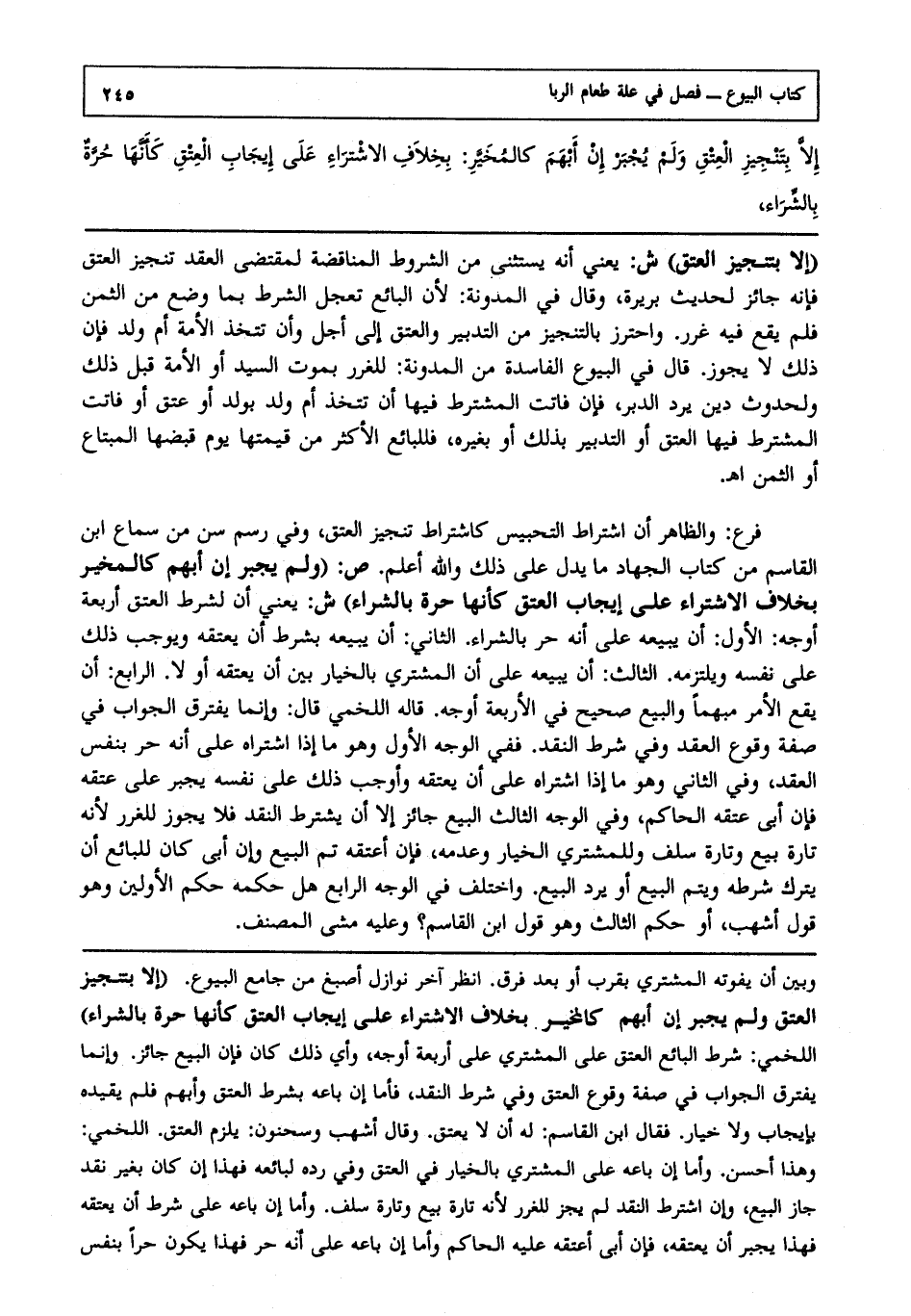 فرع: والظاهر أن اشتراط التحبيس كاشتراط تنجيز العتق وفي رسم سن من سماع ابن القاسم من كتاب الجهاد ما يدل على ذلك، والله أعلم.ص: (ولم يجبر إن أبهم كالمخير بخلاف الاشتراء على إيجاب العتق كأنها حرة بالشراء) ش: يعني أن لشرط العتق أربعة أوجه، الأول أن يبيعه على أنه حر بالشراء، الثاني أن يبيعه بشرط أن يعتقه ويوجب ذلك على نفسه ويلتزمه، الثالث أن يبيعه على أن المشتري بالخيار بين أن يعتقه أو لا، الرابع: أن يقع الأمر مبهما والبيع صحيح في الأربعة أوجه قاله اللخمي قال وإنما يفترق الجواب في صفة وقوع العقد وفي شرط النقد ففي الوجه الأول وهو ما إذا اشتراه على أنه حر بنفس العقد وفي الثاني وهو ما إذا اشتراه على أن يعتقه وأوجب ذلك على نفسه يجبر على عتقه فإن أبى عتقه الحاكم وفي الوجه الثالث البيع جائز إلا أن يشترط النقد فلا يجوز للغرر؛ لأنه تارة بيع وتارة سلف وللمشتري الخيار وعدمه فإن أعتقه تم البيع وإن أبى كان للبائع أن يترك شرطه ويتم البيع أو يرد البيع واختلف في الوجه الرابع هل حكمه حكم الأولين وهو قول أشهب أو حكم الثالث وهو قول ابن القاسم؟ وعليه مشى المصنف.