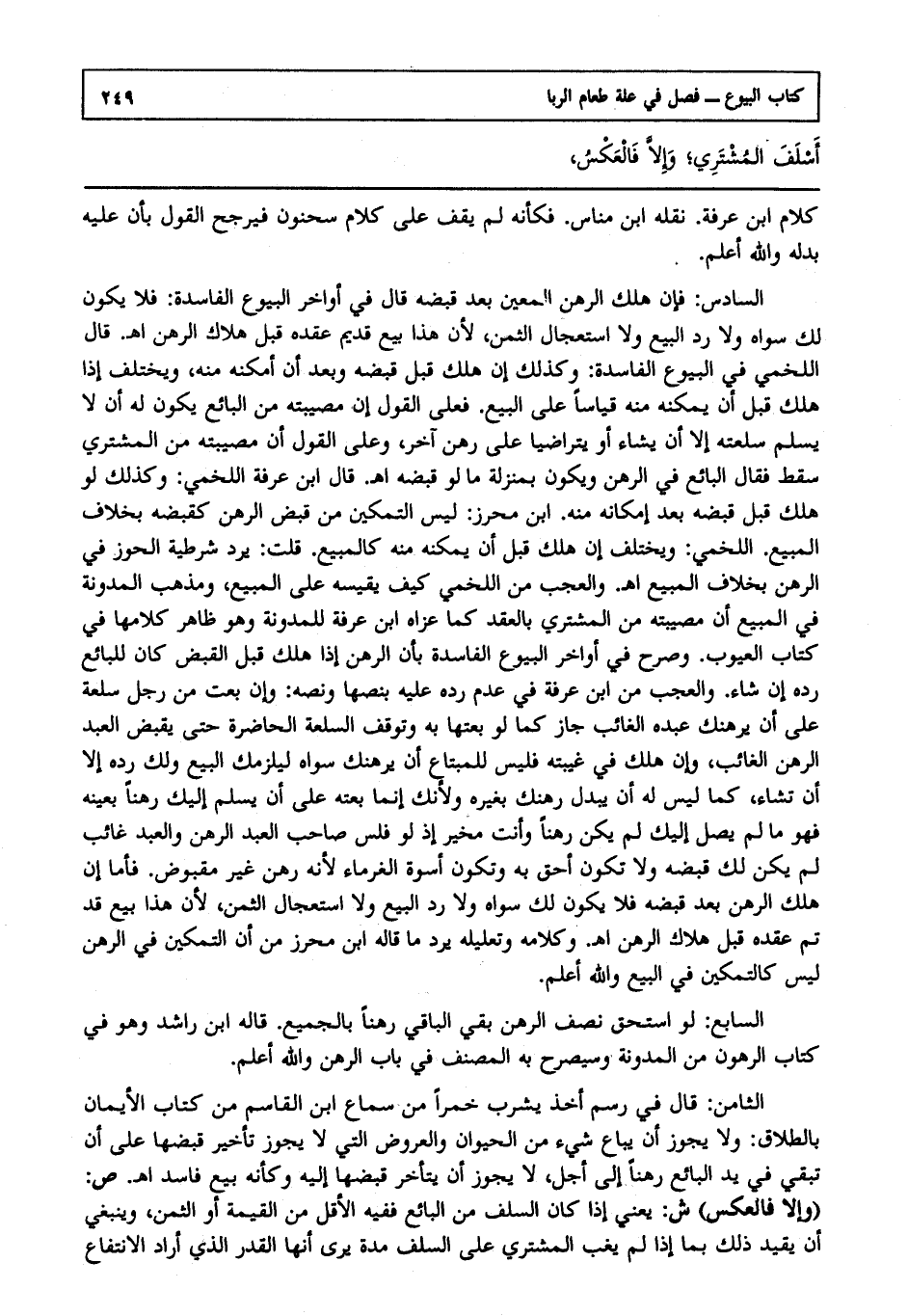 السابع: لو استحق نصف الرهن بقي الباقي رهنا بالجميع قاله ابن راشد وهو في كتاب الرهون من المدونة وسيصرح به المصنف في باب الرهن، والله أعلم. الثامن قال في رسم أخذ يشرب خمرا من سماع ابن القاسم من كتاب الأيمان بالطلاق ولا يجوز أن يباع شيء من الحيوان، والعروض التي لا يجوز تأخير قبضها على أن تبقى في يد البائع رهنا إلى أجل لا يجوز أن يتأخر قبضها إليه وكأنه بيع فاسد ا هـ. ص: (وإلا فالعكس) ش: يعني إذا كان السلف من البائع ففيه الأقل من القيمة أو الثمن وينبغي أن يقيد ذلك بما إذا لم يغب المشتري على السلف مدة يرى أنها القدر الذي أراد الانتفاع
