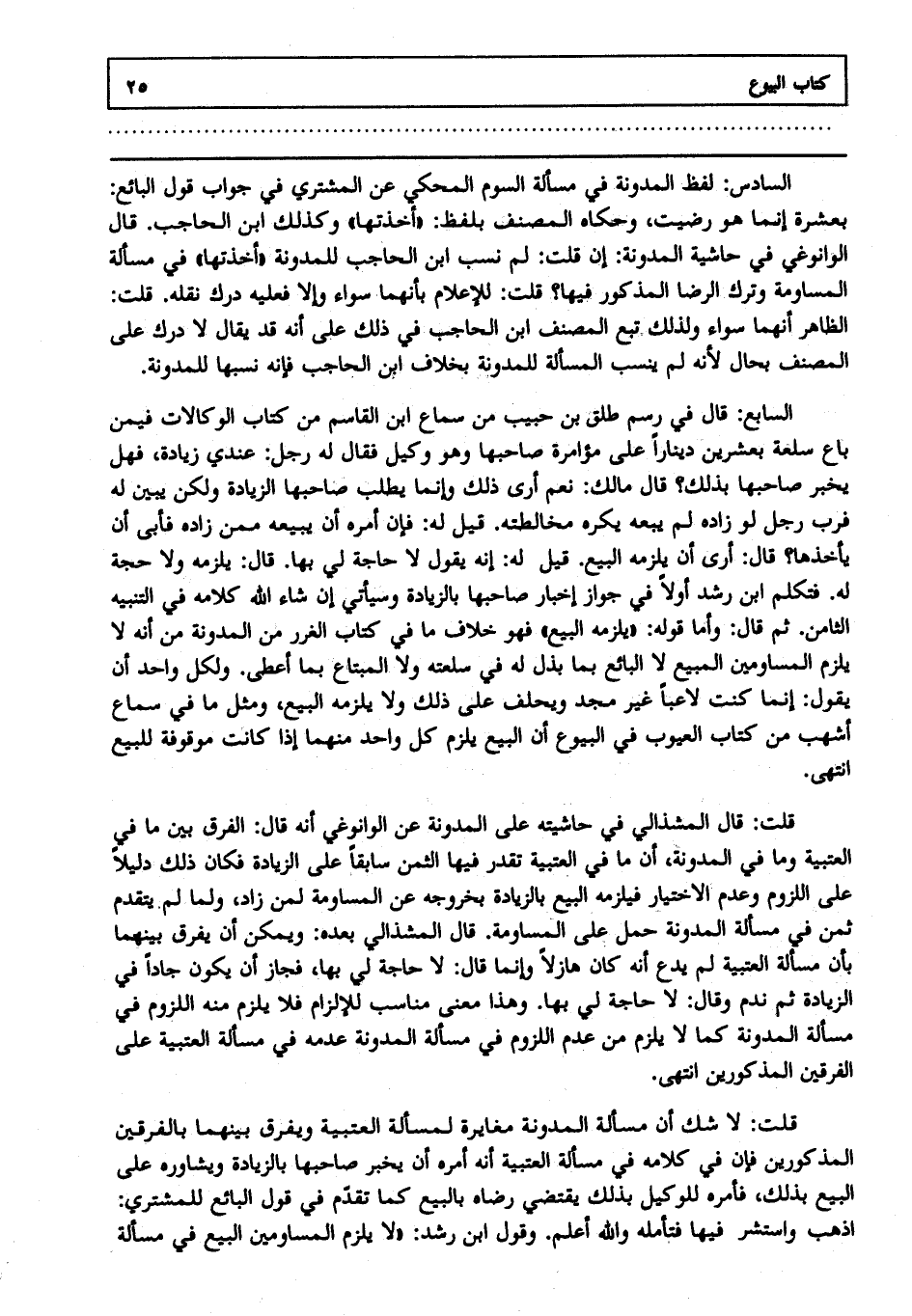 السابع: قال في رسم طلق بن حبيب من سماع ابن القاسم من كتاب الوكالات فيمن باع سلعة بعشرين دينارا على مؤامرة صاحبها وهو وكيل فقال له رجل: عندي زيادة فهل يخبر صاحبها بذلك. ؟ قال مالك نعم أرى ذلك، وإنما يطلب صاحبها الزيادة ولكن يبين له فرب رجل لو زاده لم يبعه يكره مخالطته. قيل له: إن أمره أن يبيعه ممن زاده فأبى أن يأخذها. ؟ قال أرى أن يلزمه البيع. قيل له: إنه يقول: لا حاجة لي بها. ؟ قال يلزمه ولا حجة له، فتكلم ابن رشد أولا في جواز إخبار صاحبها بالزيادة وسيأتي إن شاء الله كلامه في التنبيه الثامن، ثم قال: وأما قوله: يلزمه البيع فهو خلاف ما في كتاب الغرر من المدونة من أنه لا يلزم المساومين المبيع لا البائع بما بذل له في سلعته، ولا المبتاع بما أعطى، ولكل واحد أن يقول: إنما كنت لاعبا غير مجد ويحلف على ذلك، ولا يلزمه البيع، ومثل ما في سماع أشهب من كتاب العيوب أن البيع يلزم كل واحد منهما إذا كانت موقوفة للبيع، انتهى.