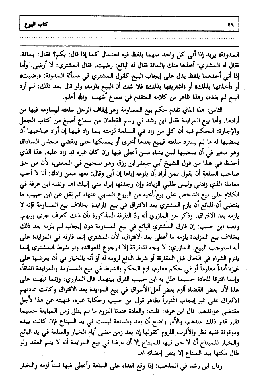 الثامن: هذا الذي تقدم حكم بيع المساومة، وهو إيقاف الرجل سلعته ليساومه فيها من أرادها، وأما بيع المزايدة فقال ابن رشد في رسم القطعان من سماع أصبغ من كتاب الجعل والإجارة: الحكم فيه أن كل من زاد في السلعة لزمته بما زاد فيها إن أراد صاحبها أن يمضيها له ما لم يسترد سلعته فيبيع بعدها أخرى أو يمسكها حتى ينقضي مجلس المناداة، وهو مخير في أن يمضيها لمن يشاء ممن أعطى فيها، وإن كان غيره قد زاد عليه، هذا الذي أحفظ في هذا من قول الشيخ أبي جعفر بن رزق، وهو صحيح في المعنى لأن من حق صاحب السلعة أن يقول لمن أراد أن يلزمه إياها إن أبى وقال: بعها ممن زادك أنا لا أحب معاملة الذي زادني وليس طلبي الزيادة، وإن وجدتها إبراء مني إليك ا هـ. ونقله ابن عرفة في الكلام على بيع الشخص على بيع أخيه من البيوع المنهي عنها، ثم نقل عن ابن حبيب ما يقتضي أن للبائع أن يلزم المشتري بعد الافتراق في بيع المزايدة، بخلاف بيع المساومة فإنه لا يلزمه بعد الافتراق، وذكر عن المازري أنه رد التفرقة المذكورة بأن ذلك كعرف جرى بينهم، ونص ابن حبيب إن فارق المشتري البائع في بيع المساومة دون إيجاب لم يلزمه بعد ذلك بخلاف بيع المزايدة يلزمه ما أعطى بعد الافتراق؛ لأن المشتري إنما فارقه في المزايدة على أنه استوجب البيع المازري لا وجه للتفرقة إلا الرجوع للعوائد، ولو شرط المشتري إنما يلتزم الشراء في الحال قبل المفارقة، أو شرط البائع لزومه له أو أنه بالخيار في أن يعرضها على غيره أمدا معلوما أو في حكم معلوم لزم الحكم بالشرط في بيع المساومة والمزايدة اتفاقا، وإنما افترقا للعادة حسبما علل به ابن حبيب الفرق بينهما. قال المازري وإنما نبهت على هذا؛ لأن بعض القضاة ألزم بعض أهل الأسواق في بيع المزايدة بعد الافتراق، وكانت عادتهم الافتراق على غير إيجاب اغترارا بظاهر قول ابن حبيب وحكاية غيره فنهيته عن هذا لأجل مقتضى عوائدهم، قال ابن عرفة قلت: والعادة عندنا اللزوم ما لم يطل زمن المبايعة حسبما تقرر قدر ذلك عندهم، والأمر واضح إن بعد والسلعة ليست في يد المبتاع، فإن كانت بيده وموقوفة ففيه نظر والأقرب اللزوم، كقولها: إن بعد زمن مضي أيام الخيار والسلعة في يد البائع والخيار للمبتاع أن لا حق فيها للمبتاع إلا إن عرفنا في بيع المزايدة أنه لا يتم العقد، ولو طال مكثها بيد المبتاع إلا بنص إمضائه ا هـ.