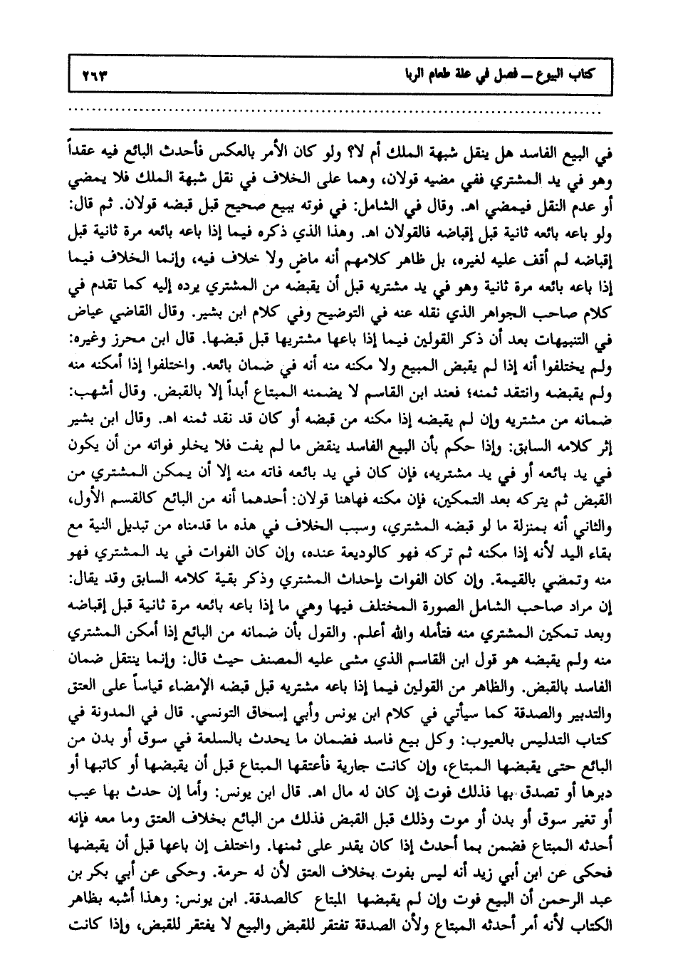 في البيع الفاسد هل ينقل شبهة الملك أم لا ولو كان الأمر بالعكس فأحدث البائع فيه عقدا وهو في يد المشتري ففي مضيه قولان وهما على الخلاف في نقل شبهة الملك فلا يمضي أو عدم النقل فيمضي ا هـ وقال في الشامل في فوته ببيع صحيح قبل قبضه قولان ثم قال ولو باعه بائعه ثانية قبل إقباضه فالقولان ا هـ وهذا الذي ذكره فيما إذا باعه بائعه مرة ثانية قبل إقباضه لم أقف عليه لغيره بل ظاهر كلامهم أنه ماض ولا خلاف فيه وإنما الخلاف فيما إذا باعه بائعه مرة ثانية وهو في يد مشتريه قبل أن يقبضه من المشتري يرده إليه كما تقدم في كلام صاحب الجواهر الذي نقله عنه في التوضيح وفي كلام ابن بشير وقال القاضي عياض في التنبيهات بعد أن ذكر القولين فيما إذا باعها مشتريها قبل قبضها قال ابن محرز وغيره ولم يختلفوا أنه إذا لم يقبض المبيع ولا مكنه منه أنه في ضمان بائعه واختلفوا إذا أمكنه منه ولم يقبضه وانتقد ثمنه فعند ابن القاسم لا يضمنه المبتاع أبدا إلا بالقبض وقال أشهب ضمانه من مشتريه وإن لم يقبضه إذا مكنه من قبضه أو كان قد نقد ثمنه ا هـ وقال ابن بشير إثر كلامه السابق وإذا حكم بأن البيع الفاسد ينقض ما لم يفت فلا يخلو فواته من أن يكون في يد بائعه أو في يد مشتريه فإن كان في يد بائعه فاته منه إلا أن يمكن المشتري من القبض ثم يتركه بعد التمكن فإن مكنه فهاهنا قولان، أحدهما أنه من البائع كالقسم الأول والثاني أنه بمنزلة ما لو قبضه المشتري وسبب الخلاف في هذه ما قدمناه من تبديل النية مع بقاء اليد؛ لأنه إذا مكنه ثم تركه فهو كالوديعة عنده وإن كان الفوات في يد المشتري فهو منه وتمضي بالقيمة وإن كان الفوات بإحداث المشتري وذكر بقية كلامه السابق وقد يقال إن مراد صاحب الشامل الصورة المختلف فيها وهي ما إذا باعه بائعه مرة ثانية قبل إقباضه وبعد تمكين المشتري منه، فتأمله، والله أعلم. والقول بأن ضمانه من البائع إذا أمكن المشتري منه ولم يقبضه هو قول ابن القاسم الذي مشى عليه المصنف حيث قال وإنما ينتقل ضمان الفاسد بالقبض والظاهر من القولين فيما إذا باعه مشتريه قبل قبضه الإمضاء قياسا على العتق والتدبير والصدقة كما سيأتي في كلام ابن يونس وأبي إسحاق التونسي قال في المدونة في كتاب التدليس بالعيوب وكل بيع فاسد فضمان ما يحدث بالسلعة في سوق أو بدن من البائع حتى يقبضها المبتاع وإن كانت جارية فأعتقها المبتاع قبل أن يقبضها أو كاتبها أو دبرها أو تصدق بها فذلك فوت إن كان له مال ا هـ قال ابن يونس وأما إن حدث بها عيب أو تغير سوق أو بدن أو موت وذلك قبل القبض فذلك من البائع بخلاف العتق وما معه فإن أحدثه المبتاع فضمن بما أحدث إذا كان يقدر على ثمنها واختلف إن باعها قبل أن يقبضها فحكي عن ابن أبي زيد أنه ليس بفوت بخلاف العتق؛ لأن له حرمة وحكي عن أبي بكر بن عبد الرحمن إن البيع فوت وإن لم يقبضها المبتاع كالصدقة ابن يونس وهذا أشبه بظاهر الكتاب؛ لأنه أمر أحدثه المبتاع؛ ولأن الصدقة تفتقر للقبض والبيع لا يفتقر للقبض وإذا كانت