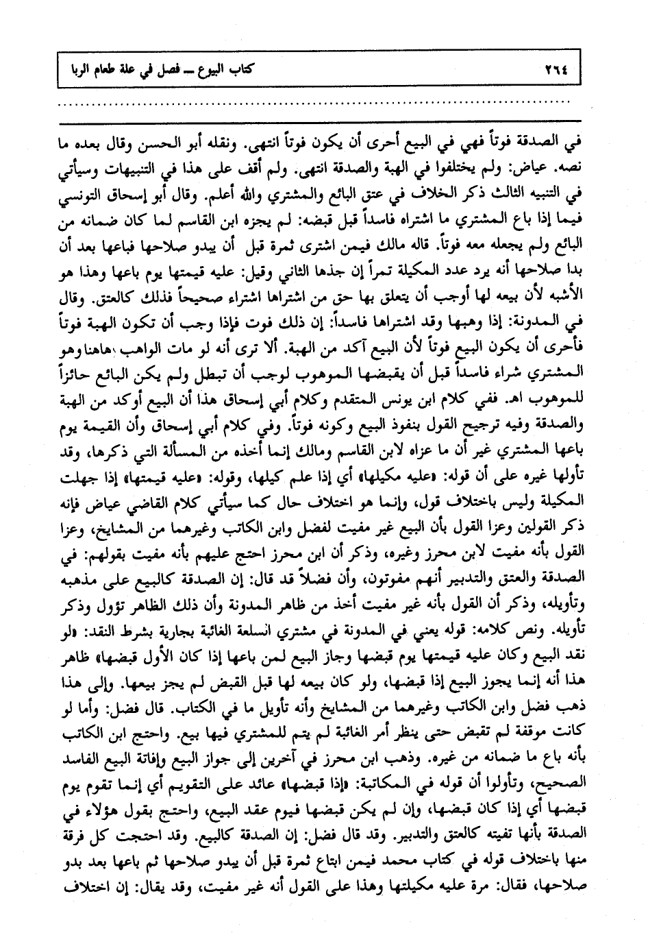 في الصدقة فوتا فهي في البيع أحرى أن يكون فوتا، انتهى. ونقله أبو الحسن وقال بعده ما نصه عياض: ولم يختلفوا في الهبة والصدقة، انتهى. ولم أقف على هذا في التنبيهات وسيأتي في التنبيه الثالث ذكر الخلاف في عتق البائع والمشتري، والله أعلم. وقال أبو إسحاق التونسي فيما إذا باع المشتري ما اشتراه فاسدا قبل قبضه لم يجزه ابن القاسم لما كان ضمانه من البائع ولم يجعله معه فوتا قاله مالك فيمن اشترى ثمرة قبل أن يبدو صلاحها فباعها بعد أن بدا صلاحها أنه يرد عدد المكيلة تمرا إن جذها الثاني وقيل عليه قيمتها يوم باعها وهذا هو الأشبه؛ لأن بيعه لها أوجب أن يتعلق بها حق من اشتراها اشتراء صحيحا فذلك كالعتق وقال في المدونة إذا وهبها وقد اشتراها فاسدا إن ذلك فوت فإذا وجب أن تكون الهبة فوتا فأحرى أن يكون البيع فوتا؛ لأن البيع آكد من الهبة ألا ترى أنه لو مات الواهب هاهنا وهو المشتري شراء فاسدا قبل أن يقبضها الموهوب لوجب أن تبطل ولم يكن البائع جائزا للموهوب ا هـ ففي كلام ابن يونس المتقدم وكلام أبي إسحاق هذا إن البيع أوكد من الهبة والصدقة وفيه ترجيح القول بنفوذ البيع وكونه فوتا وفي كلام أبي إسحاق وأن القيمة يوم باعها المشتري غير أن ما عزاه لابن القاسم ومالك إنما أخذه من المسألة التي ذكرها وقد تأولها غيره على أن قوله عليه مكيلها أي إذا علم كيلها وقوله عليه قيمتها إذا جهلت المكيلة وليس باختلاف قول وإنما هو اختلاف حال كما سيأتي كلام القاضي عياض فإنه ذكر القولين وعزا القول بأن البيع غير مفيت لفضل وابن الكاتب وغيرهما من المشايخ وعزا القول بأنه مفيت لابن محرز وغيره وذكر أن ابن محرز احتج عليهم بأنه مفيت بقولهم في الصدقة والعتق والتدبير إنهم مفوتون وإن فضلا قد قال إن الصدقة كالبيع على مذهبه وتأويله وذكر أن القول بأنه غير مفيت أخذ من ظاهر المدونة وأن ذلك الظاهر تؤول وذكر تأويله ونص كلامه قوله يعني في المدونة في مشتري السلعة الغائبة بجارية بشرط النقد لو نقد البيع وكان عليه قيمتها يوم قبضها وجاز البيع لمن باعها إذا كان الأول قبضها ظاهر هذا أنه إنما يجوز البيع إذا قبضها ولو كان بيعه لها قبل القبض لم يجز بيعها وإلى هذا ذهب فضل وابن الكاتب وغيرهما من المشايخ وأنه تأويل ما في الكتاب قال فضل وأما لو كانت موقفة لم تقبض حتى ينظر أمر الغائبة لم يتم للمشتري فيها بيع، واحتج ابن الكاتب بأنه باع ما ضمانه من غيره وذهب ابن محرز في آخرين إلى جواز البيع وإفاتة البيع الفاسد الصحيح وتأولوا أن قوله في المكاتبة إذا قبضها عائد على التقويم أي إنما تقوم يوم قبضها أي إذا كان قبضها وإن لم يكن قبضها فيوم عقد البيع واحتج بقول هؤلاء في الصدقة بأنها تفيته كالعتق والتدبير وقد قال فضل إن الصدقة كالبيع وقد احتجت كل فرقة منها باختلاف قوله في كتاب محمد فيمن ابتاع ثمرة قبل أن يبدو صلاحها ثم باعها بعد بدو صلاحها فقال مرة عليه مكيلتها وهذا على القول أنه غير مفيت وقد يقال إن اختلاف