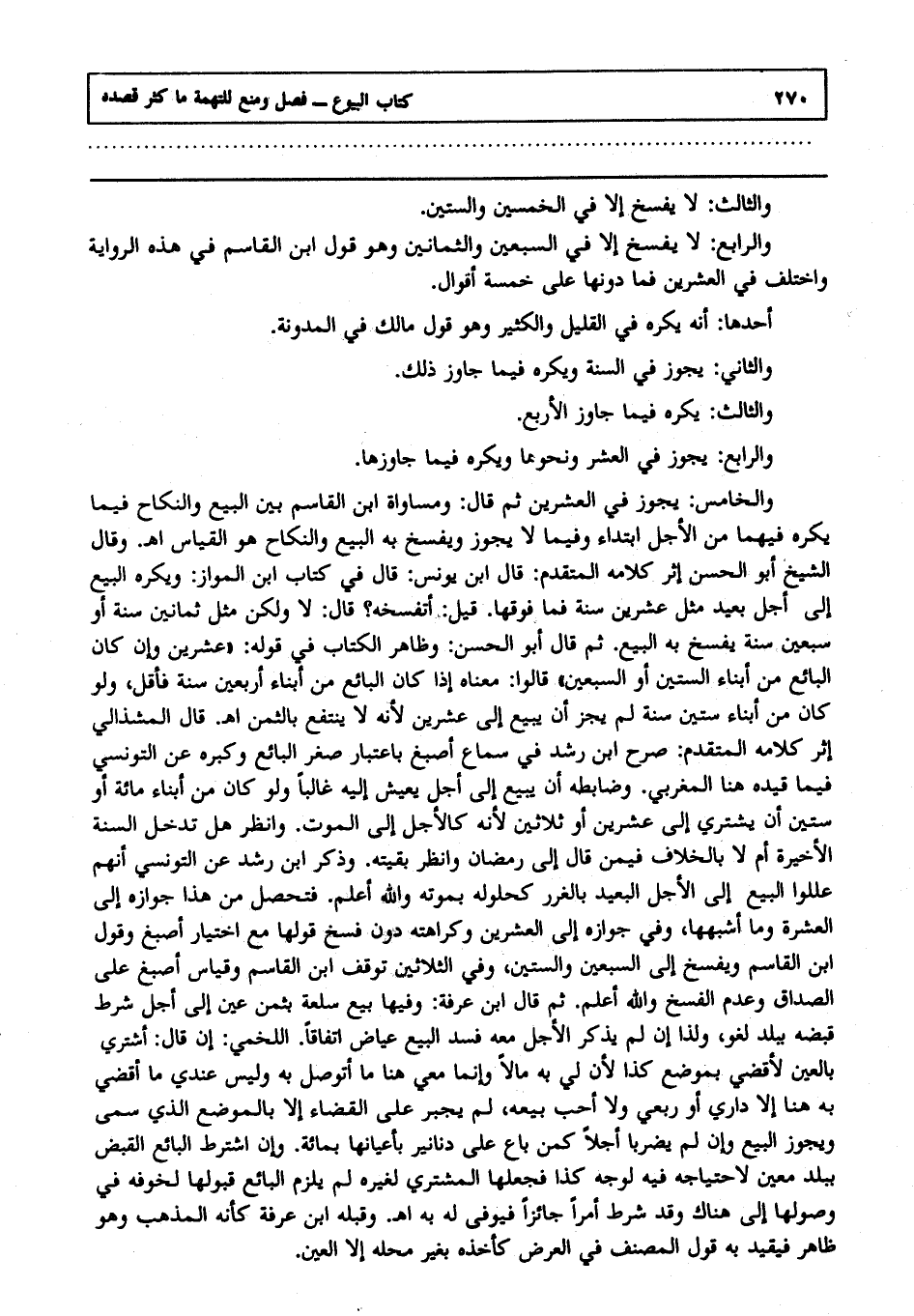 والخامس: يجوز في العشرين ثم قال: ومساواة ابن القاسم بين البيع والنكاح فيما يكره فيهما من الأجل ابتداء وفيما لا يجوز ويفسخ به البيع والنكاح هو القياس ا هـ، وقال الشيخ أبو الحسن إثر كلامه المتقدم قال ابن يونس قال في كتاب ابن المواز ويكره البيع إلى أجل بعيد، مثل عشرين سنة فما فوقها قيل أتفسخه قال لا ولكن مثل ثمانين سنة أو سبعين سنة يفسخ به البيع ثم قال أبو الحسن وظاهر الكتاب في قوله "عشرين وإن كان البائع من أبناء الستين أو السبعين" قالوا معناه إذا كان البائع من أبناء أربعين سنة فأقل ولو كان من أبناء ستين سنة لم يجز أن يبيع إلى عشرين؛ لأنه لا ينتفع بالثمن ا هـ. قال المشذالي إثر كلامه المتقدم صرح ابن رشد في سماع أصبغ باعتبار صغر البائع وكبره عن التونسي فيما قيده هنا المغربي وضابطه أن يبيع إلى أجل يعيش إليه غالبا ولو كان من أبناء مائة أو ستين أن يشتري إلى عشرين أو ثلاثين؛ لأنه كالأجل إلى الموت. وانظر هل تدخل السنة الأخيرة أم لا بالخلاف فيمن قال إلى رمضان وانظر بقيته وذكر ابن رشد عن التونسي أنهم عللوا البيع إلى الأجل البعيد بالغرر كحلوله بموته، والله أعلم. فتحصل من هذا جوازه إلى العشرة وما أشبهها وفي جوازه إلى العشرين وكراهته دون فسخ قولها مع اختيار أصبغ وقول ابن القاسم ويفسخ إلى السبعين والستين وفي الثلاثين توقف ابن القاسم وقياس أصبغ على الصداق وعدم الفسخ، والله أعلم. ثم قال ابن عرفة وفيها بيع سلعة بثمن عين إلى أجل شرط قبضه ببلد لغو ولذا إن لم يذكر الأجل معه فسد البيع عياض اتفاقا اللخمي إن قال أشتري بالعين لأقضي بموضع كذا؛ لأن لي به مالا وإنما معي هنا ما أتوصل به. وليس عندي ما أقضي به هنا إلا داري أو ربعي ولا أحب بيعه لم يجبر على القضاء إلا بالموضع الذي سعى ويجوز البيع وإن لم يضربا أجلا كمن باع على دنانير بأعيانها بمائة وإن اشترط البائع القبض ببلد معين لاحتياجه فيه لوجه كذا فجعلها المشتري لغيره لم يلزم البائع قبولها لخوفه في وصولها إلى هناك وقد شرط أمرا جائزا فيوفى له به ا هـ وقبله ابن عرفة كأنه المذهب وهو ظاهر فيقيد به قول المصنف في العرض كأخذه بغير محله إلا العين.