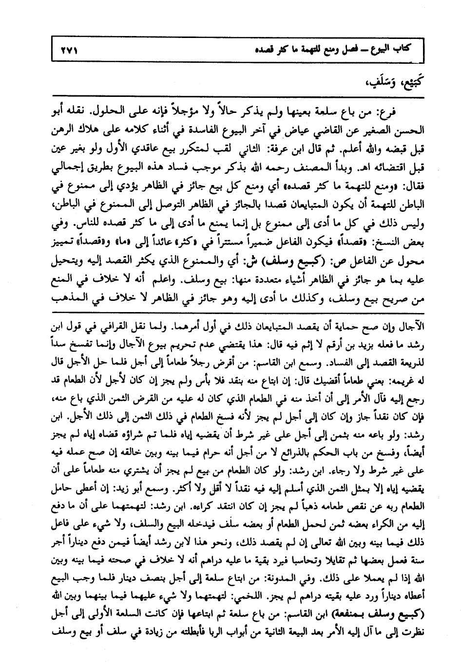 وبدأ المصنف - رحمه الله - بذكر موجب فساد هذه البيوع بطريق إجمالي فقال ومنع للتهمة ما كثر قصده أي ومنع كل بيع جائز في الظاهر يؤدي إلى ممنوع في الباطن للتهمة أن يكون المتبايعان قصدا بالجائز في الظاهر التوصل إلى الممنوع في الباطن وليس ذلك في كل ما أدى إلى ممنوع بل إنما يمنع ما أدى إلى ما كثر قصده للناس وفي بعض النسخ قصدا فيكون الفاعل ضميرا مستترا في "كثر" عائدا إلى "ما" و"قصدا" تمييز محول عن الفاعل ص: (كبيع وسلف) ش: أي والممنوع الذي يكثر القصد إليه ويتحيل عليه بما هو جائز في الظاهر أشياء متعددة منها بيع وسلف واعلم أنه لا خلاف في المنع من صريح بيع وسلف وكذلك ما أدى إليه وهو جائز في الظاهر لا خلاف في المذهب