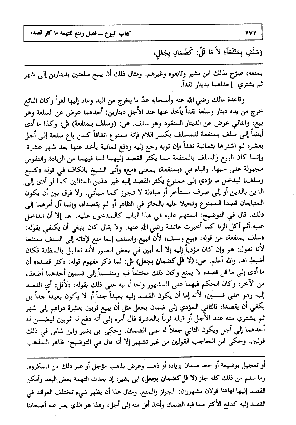 وقاعدة مالك رضي الله عنه وأصحابه عد ما يخرج من اليد وعاد إليها لغوا وكان البائع خرج من يده دينار وسلعة نقدا يأخذ عنها عند الأجل دينارين أحدهما عوض عن السلعة وهو بيع والثاني عوض عن الدينار المنقود وهو سلف ص: (وسلف بمنفعة) ش: وكذا ما أدى أيضا إلى سلف بمنفعة للمسلف بكسر اللام فإنه ممنوع اتفاقا كمن باع سلعة إلى أجل بعشرة ثم اشتراها بثمانية نقدا فإن ثوبه رجع إليه ودفع ثمانية يأخذ عنها بعد شهر عشرة وإنما كان البيع والسلف بالمنفعة مما يكثر القصد إليهما لما فيهما من الزيادة، والنفوس مجبولة على حبها والباء في "بمنفعة" بمعنى "مع" وأتى الشيخ بالكاف في قوله: "كبيع وسلف" ليدخل ما يؤدي إلى ممنوع يكثر القصد إليه غير هذين المثالين كما لو أدى إلى الدين بالدين أو إلى صرف مستأخر أو مبادلة لا تجوز كما سيأتي ولا فرق بين أن يكون المتبايعان قصدا الممنوع وتحيلا عليه بالجائز في الظاهر أو لم يقصداه وإنما آل أمرهما إلى ذلك قال في التوضيح المتهم عليه في هذا الباب كالمدخول عليه ا هـ إلا أن الداخل عليه آثم آكل الربا كما أخبرت عائشة رضي الله عنها ولا يقال كان ينبغي أن يكتفي بقوله: سلف بمنفعة عن قوله: بيع وسلف؛ لأن البيع والسلف إنما منع لأدائه إلى السلف بمنفعة؛ لأنا نقول هو وإن كان مؤديا إليه إلا أنه أبين في بعض الصور؛ لأنه تعليل بالمظنة فكان أضبط ا هـ، والله أعلم ص: (لأقل كضمان بجعل) ش: لما ذكر مفهوم قوله كثر قصده إن ما أدى إلى ما قل قصده لا يمنع وكان ذلك مختلفا فيه ومنقسما إلى قسمين أحدهما أضعف من الآخر وكان الحكم فيهما على المشهور واحدا نبه على ذلك بقوله لأقل أي القصد إليه وهو على قسمين؛ لأنه إما أن يكون القصد إليه بعيدا جدا أو لا يكون بعيدا جدا بل يكفي أن يقصد فالثاني المؤدي إلى ضمان بجعل مثل أن يبيع ثوبين بعشرة دراهم إلى شهر ثم يشتري منه عند الأجل أو قبله ثوبا بالعشرة فآل أمره إلى أنه دفع له ثوبين ليضمن له أحدهما إلى أجل ويكون الثاني جعلا له على الضمان حكى ابن بشير وابن شاس في ذلك قولين وحكى ابن الحاجب القولين من غير تشهير إلا أنه قال في التوضيح: ظاهر المذهب