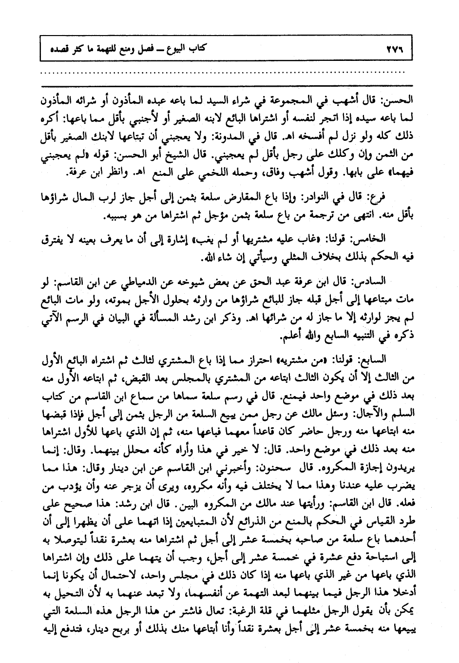 السادس: قال ابن عرفة عبد الحق عن بعض شيوخه عن الدمياطي عن ابن القاسم لو مات مبتاعها إلى أجل قبله جاز للبائع شراؤها من وارثه بحلول الأجل بموته ولو مات البائع لم يجز لوارثه إلا ما جاز له من شرائها ا هـ وذكر ابن رشد المسألة في البيان في الرسم الآتي ذكره في التنبيه السابع، والله أعلم.