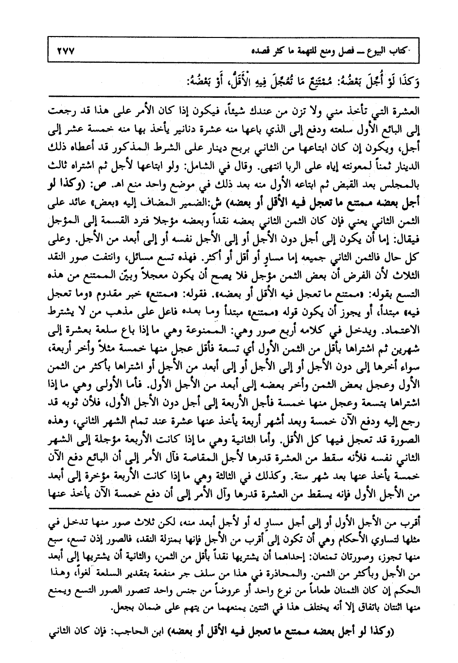 العشرة التي تأخذ مني ولا نزن من عندك شيئا فيكون إذا كان الأمر على هذا قد رجعت إلى البائع الأول سلعته ودفع إلى الذي باعها منه عشرة دنانير يأخذ بها منه خمسة عشر إلى أجل ويكون إن كان ابتاعها من الثاني بربح دينار على الشرط المذكور قد أعطاه ذلك الدينار ثمنا لمعونته إياه على الربا، انتهى. وقال في الشامل ولو ابتاعها لأجل ثم اشتراه ثالث بالمجلس بعد القبض ثم ابتاعه الأول منه بعد ذلك في موضع واحد منع ا هـ ص: (وكذا لو أجل بعضه ممتنع ما تعجل فيه الأقل أو بعضه) ش: الضمير المضاف إليه بعض عائد على الثمن الثاني يعني فإن كان الثمن الثاني بعضه نقدا أو بعضه مؤجلا فترد القسمة إلى المؤجل فيقال إما أن يكون إلى أجل دون الأجل أو إلى الأجل نفسه أو إلى أبعد من الأجل وعلى كل حال فالثمن الثاني جميعه إما مساو أو أقل أو أكثر فهذه تسع مسائل وانتفت صور النقد الثلاث؛ لأن الفرض أن بعض الثمن مؤجل فلا يصح أن يكون معجلا وبين الممتنع من هذه التسع بقوله "ممتنع ما تعجل فيه الأقل أو بعضه" فقوله "ممتنع" خبر مقدم وما تعجل فيه مبتدأ ويجوز أن يكون قوله "ممتنع" مبتدأ وما بعده فاعل على مذهب من لا يشترط الاعتماد ويدخل في كلامه أربع صور وهي الممنوعة وهي ما إذا باع سلعة بعشرة إلى شهرين ثم اشتراها بأقل من الثمن الأول أي تسعة فأقل عجل منها خمسة مثلا وأخر أربعة سواء أخرها إلى دون الأجل أو إلى الأجل أو إلى أبعد من الأجل أو اشتراها بأكثر من الثمن الأول وعجل بعض الثمن وأخر بعضه إلى أبعد من الأجل الأول فأما الأولى وهي ما إذا اشتراها بتسعة وعجل منها خمسة فأجل الأربعة إلى أجل دون الأجل الأول؛ فلأن ثوبه قد رجع إليه ودفع الآن خمسة وبعد أشهر أربعة يأخذ عنها عشرة عند تمام الشهر الثاني وهذه الصورة قد تعجل فيها كل الأقل وأما الثانية وهي ما إذا كانت الأربعة مؤجلة إلى الشهر الثاني نفسه؛ فلأنه سقط من العشرة قدرها لأجل المقاصة فآل الأمر إلى أن البائع دفع الآن خمسة يأخذ عنها