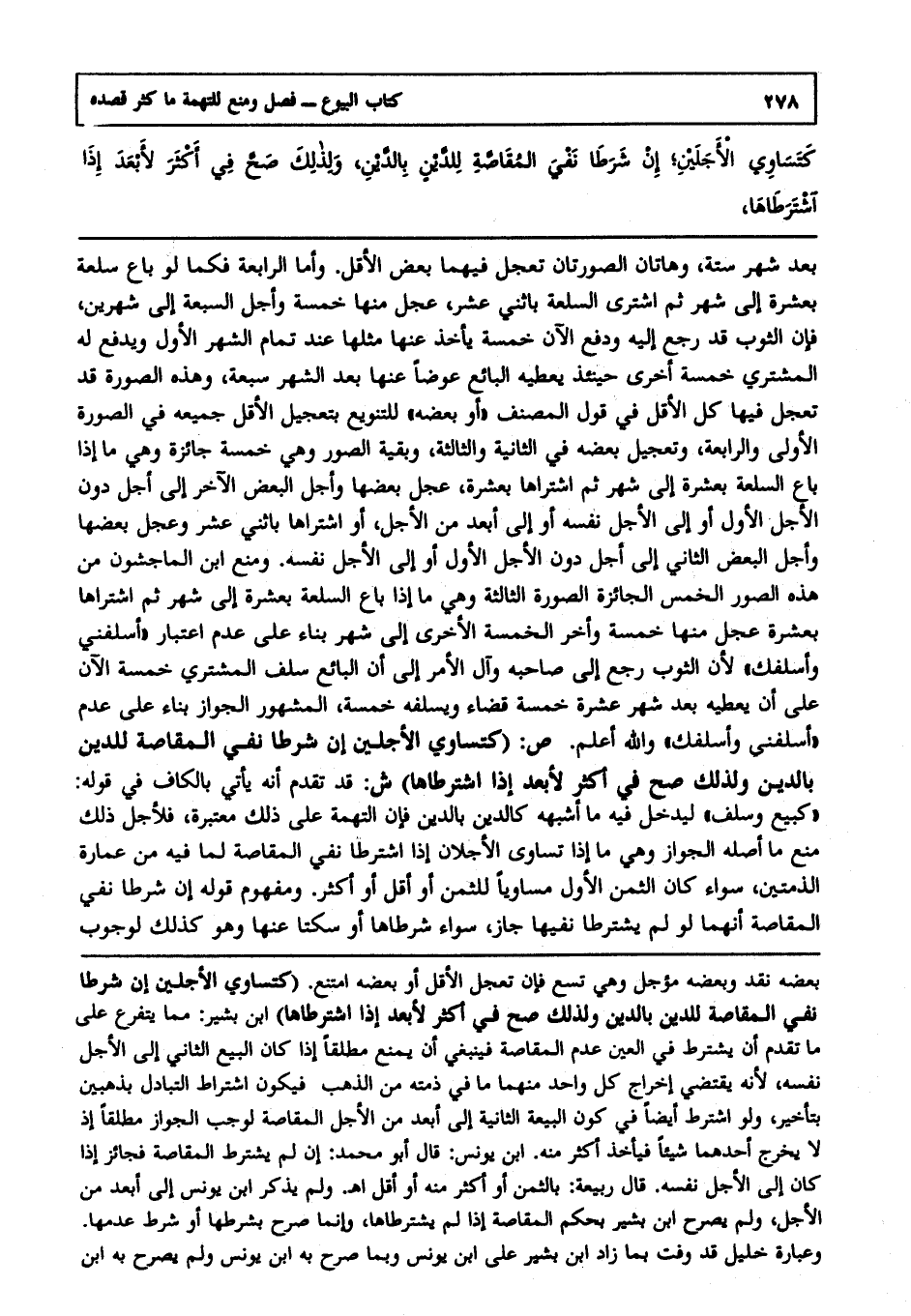 بعد شهر ستة, وكذلك في الثالثة وهي ما إذا كانت الأربعة مؤخرة إلى أبعد من الأجل الأول فإنه يسقط من العشرة قدرها وآل الأمر إلى أن دفع خمسة الآن يأخذ عنها بعد شهر ستة وهاتان الصورتان تعجل فيهما بعض الأقل وأما الرابعة فكما لو باع سلعة بعشرة إلى شهر ثم اشترى السلعة باثني عشر عجل منها خمسة وأجل السبعة إلى شهرين فإن الثوب قد رجع إليه ودفع الآن خمسة يأخذ عنها مثلها عند تمام الشهر الأول ويدفع له المشتري خمسة أخرى حينئذ يعطيه البائع عوضا عنها بعد الشهر سبعة وهذه الصورة قد تعجل فيها كل الأقل في قول المصنف "أو بعضه" للتنويع بتعجيل الأقل جميعه في الصورة الأولى والرابعة وتعجيل بعضه في الثانية والثالثة وبقية الصور وهي خمسة جائزة وهي ما إذا باع السلعة بعشرة إلى شهر ثم اشتراها بعشرة عجل بعضها وأجل البعض الآخر إلى الأجل دون الأجل الأول أو إلى الأجل نفسه أو إلى أبعد من الأجل أو اشتراها باثني عشر وعجل بعضها وأجل البعض الثاني إلى أجل دون الأجل الأول أو إلى الأجل نفسه ومنع ابن الماجشون من هذه الصور الخمس الجائزة الصورة الثالثة وهي ما إذا باع السلعة بعشرة إلى شهر ثم اشتراها بعشرة عجل منها خمسة وأخر الخمسة الأخرى إلى شهر بناء على عدم اعتبار "أسلفني وأسلفك" لأن الثوب رجع إلى صاحبه وآل الأمر إلى أن البائع سلف المشتري خمسة الآن على أن يعطيه بعد شهر عشرة خمسة قضاء ويسلفه خمسة المشهور الجواز بناء على عدم "أسلفني وأسلفك" والله أعلم.ص: (كتساوي الأجلين إن شرطا نفي المقاصة للدين بالدين ولذلك صح في أكثر لأبعد إذا شرطاها) ش: قد تقدم أنه يأتي بالكاف في قوله كبيع وسلف ليدخل فيه ما أشبهه كالدين بالدين فإن التهمة على ذلك معتبرة فلأجل ذلك منع ما أصله الجواز وهي ما إذا تساوى الأجلان إذا اشترطا نفي المقاصة لما فيه من عمارة الذمتين سواء كان الثمن الأول مساويا للثمن أو أقل أو أكثر ومفهوم قوله إن شرطا نفي المقاصة أنهما لو لم يشترطا نفيها جاز سواء شرطاها أو سكتا عنها وهو كذلك لوجوب