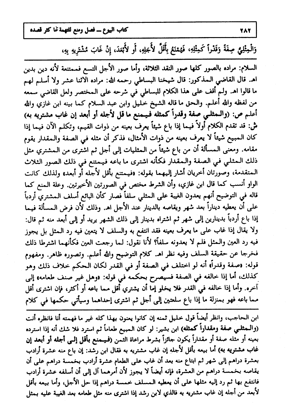 السلام: مراده بالصور كلها صور النقد الثلاثة وأما صور الأجل التسع فممتنعة؛ لأنه دين بدين ا هـ، قال القاضي المذكور: قال شيخنا البساطي - رحمه الله - مراده الاثنا عشر ولا أسلم لهم ما قالوا ا هـ، ولم أقف على هذا الكلام للبساطي في شرحه على المختصر ولعل القاضي سمعه من لفظه، والله أعلم. والحق ما قاله الشيخ خليل وابن عبد السلام كما بينه ابن غازي، والله أعلم. ص: (والمثلي صفة وقدرا كمثله فيمنع ما قل لأجله أو أبعد إن غاب مشتريه به) ش: قد تقدم الكلام أولا فيما إذا باع شيئا يعرف بعينه من ذوات القيم وتكلم الآن فيما إذا كان المبيع شيئا لا يعرف بعينه من ذوات الأمثال فذكر أن مثله في الصفة والمقدار يقوم مقامه ومعنى المسألة أن من باع شيئا من المثليات إلى أجل ثم اشترى من المشتري مثل ذلك المثلي في الصفة والمقدار فكأنه اشترى ما باعه فيمتنع في ذلك الصور الثلاث المتقدمة وصورتان أخريان أشار إليهما بقوله "فيمتنع بأقل لأجله أو أبعد" ولذلك كانت الواو أنسب كما قال ابن غازي: وإن الشرط مختص في الصورتين الأخيرتين، وعلة المنع كما قاله في التوضيح أنهم يعدون الغيبة على المثلي سلفا فصار كأن البائع أسلف المشتري إردبا على أن يعطيه دينارا بعد شهر ويقاصه بالدينار عند الأجل ا هـ، وذلك لأن فرض المسألة فيما إذا باع إردبا بدينارين إلى شهر ثم اشتراه بدينار إلى ذلك الشهر يريد أو إلى أبعد منه ثم قال ولا يقال إذا غاب على ما يعرف بعينه فقد انتفع به والسلف لا يتعين فيه رد المثل بل يجوز فيه رد العين والمثل فلم لا يعدونه سلفا؛ لأنا نقول لما رجعت العين فكأنهما اشترطا ذلك فخرجا عن حقيقة السلف وفيه نظر ا هـ كلام التوضيح، والله أعلم. وتصوره ظاهر ومفهوم قوله صفة وقدرا أنه لو اختلف في الصفة أو في القدر لكان الحكم خلاف ذلك وهو كذلك أما إذا خالفه في الصفة فسيصرح بحكمه في قوله وهل غير صنف طعامه إلى آخره وأما إذا خالفه في القدر فلا يخلو إما أن يشتري أقل مما باعه أو أكثر فإن اشترى أقل مما باعه فهو بمنزلة ما إذا باع سلعتين إلى أجل ثم اشترى أحدهما وسيأتي حكمها في كلام