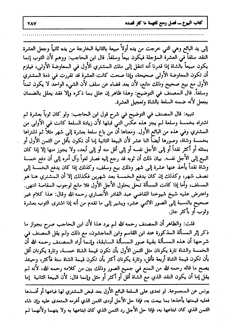 قلت: والظاهر أن المصنف - رحمه الله - لم يرد هذا؛ لأن ابن الحاجب صرح بجواز ما ذكر إثر المسألة المذكورة عند ابن القاسم وابن الماجشون مع ذلك ولم يقل المصنف في شرحها إن هذه المسألة بقية صور المسألة السابقة وإنما أراد المصنف - رحمه الله - أن الخمسة والشاة تارة يكونان مثل الثمن الأول بأن تكون قيمة الشاة خمسة وتارة يكونان أقل بأن تكون قيمة الشاة أربعة فأقل وتارة يكونان أكثر بأن تكون قيمة الشاة ستة فأكثر وحينئذ يصح ما قاله - رحمه الله - من المنع في جميع الصور وذلك بين من كلامه - رحمه الله -؛ لأنه لم يقل إما أن يكون النقد الذي مع الشاة أقل أو أكثر أو مثل وإنما قال: لأن البيعة الثانية إما