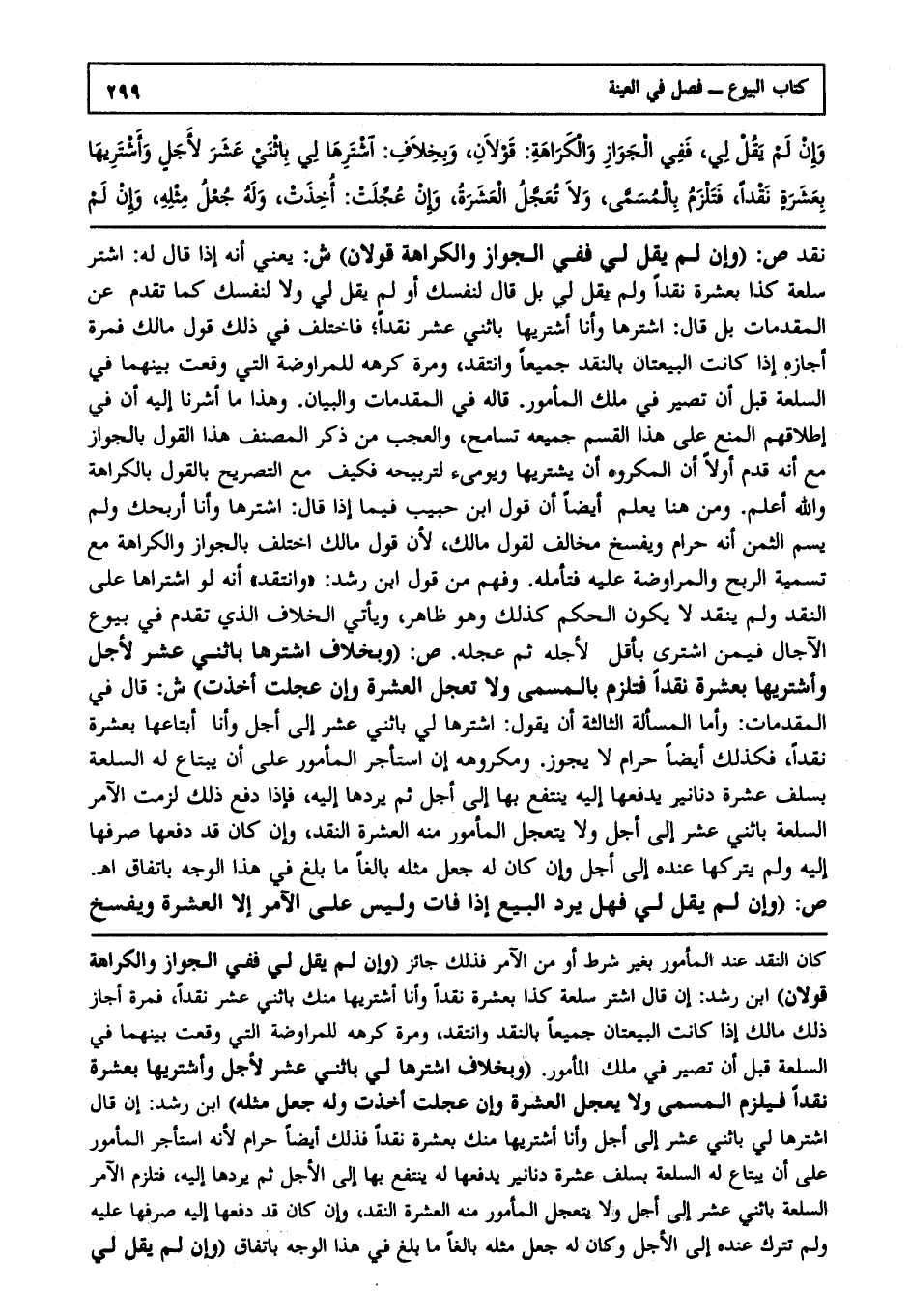 نقد ص: (وإن لم يقل لي في الجواز والكراهة قولان) ش: يعني أنه إذا قال له اشتر سلعة كذا بعشرة نقدا ولم يقل لي بل قال لنفسك أو لم يقل لي ولا لنفسك كما تقدم عن المقدمات بل قال اشترها وأنا أشتريها باثني عشر نقدا فاختلف في ذلك قول مالك فمرة أجازه إذا كانت البيعتان بالنقد جميعا وانتقد ومرة كرهه للمراوضة التي وقعت بينهما في السلعة قبل أن تصير في ملك المأمور قاله في المقدمات والبيان وهذا ما أشرنا إليه أن في إطلاقهم المنع على هذا القسم جميعه تسامح والعجب من ذكر المصنف هذا القول بالجواز مع أنه قدم أولا أن المكروه أن يشتريها ويومئ لتربيحه فكيف مع التصريح بالقول بالكراهة، والله أعلم. ومن هنا يعلم أيضا أن قول ابن حبيب فيما إذا قال اشترها وأنا أربحك ولم يسم الثمن أنه حرام ويفسخ مخالف لقول مالك؛ لأن قول مالك اختلف بالجواز والكراهة مع تسمية الربح والمراوضة عليه فتأمله وفهم من قول ابن رشد وانتقد أنه لو اشتراها على النقد ولم ينقد لا يكون الحكم كذلك وهو ظاهر ويأتي الخلاف الذي تقدم في بيوع الآجال فيمن اشترى بأقل لأجله ثم عجله.