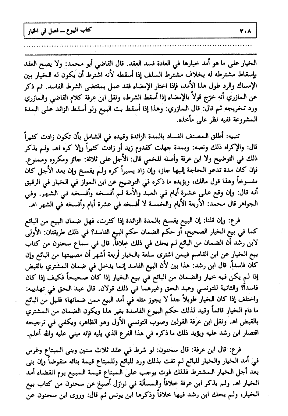 الخيار على ما هو أمد خيارها في العادة فسد العقد قال القاضي أبو محمد: ولا يصح العقد بإسقاط مشترطه له بخلاف مشترط السلف إذا أسقطه لأنه اشترط أن يكون له الخيار بين الإمساك والرد طول هذا الأمد فإذا اختار الإمضاء، فقد عمل بمقتضى الشرط الفاسد، ثم ذكر عن المازري أنه خرج قولا بالإمضاء إذا أسقط الشرط، ونقل ابن عرفة كلام القاضي والمازري ورد تخريجه، ثم قال: قال المازري: وهذا إذا أسقط بت البيع، ولو أسقط الزائد على المدة المشروعة ففيه نظر على مأخذه.