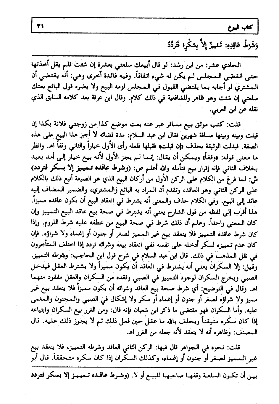 قلت: كتب موثق بيع مسافر عبر عنه بعت موضوع كذا من زوجتي فلانة بكذا إن قبلت، وبينه وبينها مسافة شهرين، فقال ابن عبد السلام مدة قضائه: لا أجيز هذا البيع على هذه الصفة فبدلت الوثيقة بحذف "إن قبلت" فقبلها، فلعله رأى الأول خيارا والثاني وقفا ا هـ. وانظر ما معنى قوله "وقفا"، ويمكن أن يقال إنما لم يجز الأول لأنه بيع خيار إلى أمد بعيد بخلاف الثاني فإنه إقرار بيع فتأمله والله أعلم ص: (وشرط عاقده تمييز إلا بسكر فتردد) ش: لما فرغ من الكلام على الركن الأول من أركان البيع الذي هو الصيغة أتبع ذلك بالكلام على الركن الثاني وهو العاقد، وتقدم أن المراد به البائع والمشتري، والضمير المضاف إليه عائد إلى البيع، وفي الكلام حذف والمعنى أنه يشترط في انعقاد البيع أن يكون عاقده مميزا هذا أقرب إلى لفظه من قول الشارح يعني أنه يشترط في صحة بيع عاقد البيع التمييز، وإن كان المعنى واحدا، وعلم أن ذلك شرط في صحة البيع من عطفه عليه شرط اللزوم، وإذا كان شرط عاقده التمييز فلا ينعقد بيع غير المميز لصغر أو جنون أو إغماء ولا شراؤه، فإن كان عدم تمييزه لسكر أدخله على نفسه ففي انعقاد بيعه وشرائه تردد إذ اختلف المتأخرون في نقل المذهب في ذلك قال ابن عبد السلام في شرح قول ابن الحاجب وشرطه التمييز وقيل: إلا السكران يعني أنه يشترط في العاقد أن يكون مميزا، ولا يشترط العقل فيدخل الصبي ويخرج السكران لوجود التمييز في الصبي وفقده من السكران والعقل مفقود منهما ا هـ. وقال في التوضيح أي شرط صحة بيع العاقد وشرائه أن يكون مميزا فلا ينعقد بيع غير مميز ولا شراؤه لصغر أو جنون أو إغماء أو سكر، ولا إشكال في الصبي والمجنون والمغمى عليه، وأما السكران فهو مقتضى ما ذكر ابن شعبان فإنه قال: ومن الغرر بيع السكران وابتياعه إذا كان سكره متيقنا، ويحلف بالله ما عقل حين فعل ذلك ثم لا يجوز ذلك عليه قال المصنف: وظاهره أنه لا ينعقد؛ لأنه جعله من الغرر ا هـ.