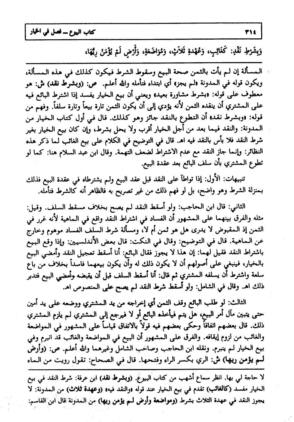 وبشرط نقد: كغائب, وعهدة ثلاث, ومواضعة, وأرض لم يؤمن ريها,