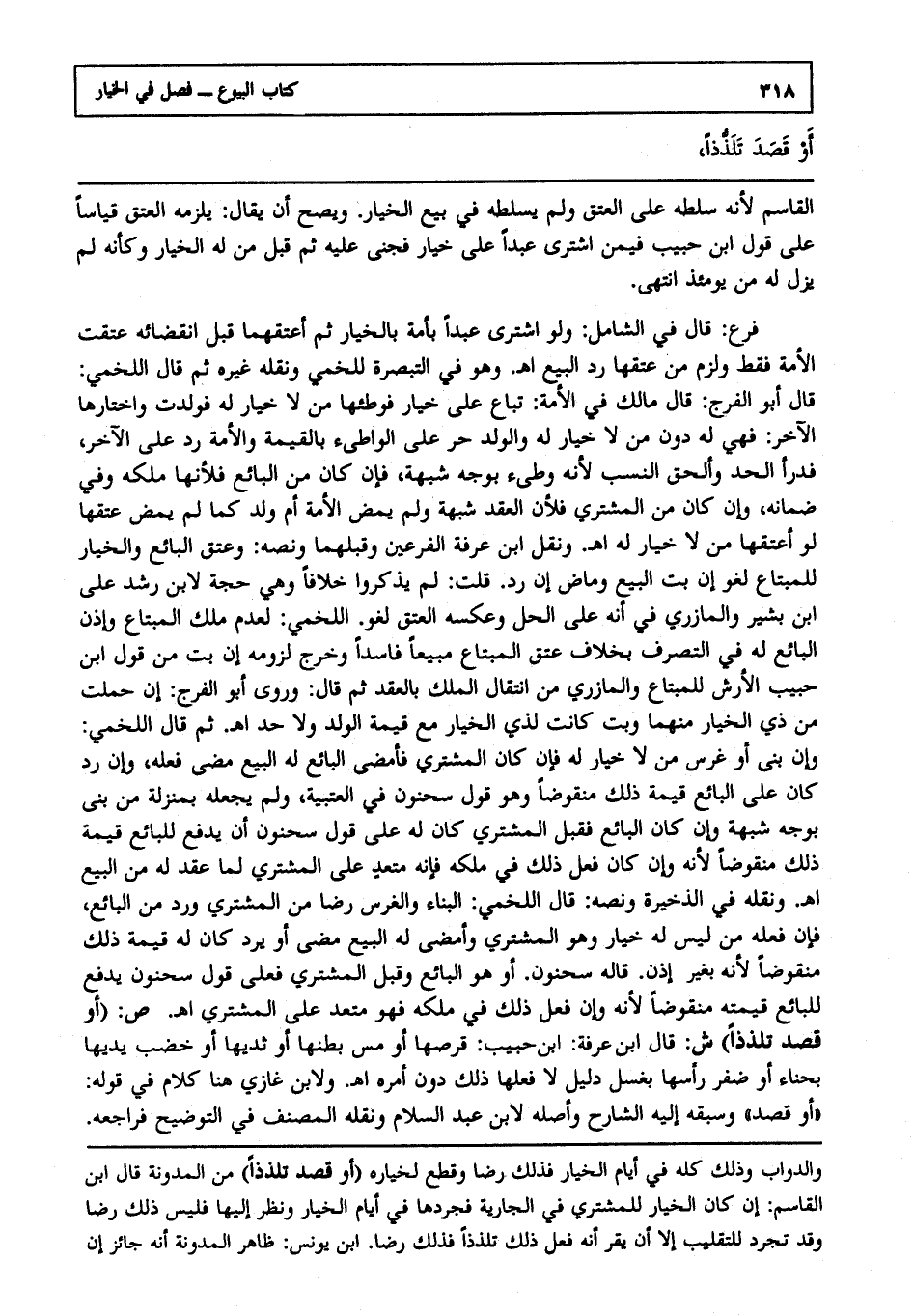 فرع: قال في الشامل: ولو اشترى عبدا بأمة بالخيار، ثم أعتقهما قبل انقضائه عتقت الأمة فقط، ولزم من عتقها رد البيع ا هـ. وهو في التبصرة للخمي، ونقله غيره، ثم قال اللخمي قال أبو الفرج قال مالك في الأمة تباع على خيار فوطئها من لا خيار له فولدت واختارها الآخر فهي له دون من لا خيار له والولد حر على الواطئ بالقيمة، والأمة رد على الآخر فدرأ الحد وألحق النسب؛ لأنه وطئ بوجه شبهة، فإن كان من البائع فلأنها ملكه، وفي ضمانه، وإن كان من المشتري فلأن العقد شبهة، ولم يمض الأمة أم ولد كما لم يمض عتقها لو أعتقها من لا خيار له ا هـ. ونقل ابن عرفة الفرعين وقبلهما، ونصه: وعتق البائع، والخيار للمبتاع لغو إن بت البيع وماض إن رد. قلت: لم يذكروا خلافا، وهي حجة لابن رشد على ابن بشير والمازري في أنه على الحل، وعكسه العتق لغو اللخمي لعدم ملك المبتاع، وإذن البائع له في التصرف بخلاف عتق المبتاع مبيعا فاسدا، وخرج لزومه إن بت من قول ابن حبيب الأرش للمبتاع والمازري من انتقال الملك بالعقد، ثم قال: وروى أبو الفرج إن حملت من ذي الخيار منهما وبت كانت لذي الخيار مع قيمة الولد، ولا حد ا هـ ثم قال اللخمي: وإن بنى، أو غرس من لا خيار له، فإن كان المشتري فأمضى البائع له البيع مضى فعله، وإن رد كان على البائع قيمة ذلك منقوضا، وهو قول سحنون في العتبية، ولم يجعله بمنزلة من بنى بوجه شبهة. وإن كان البائع فقبل المشتري كان له على قول سحنون أن يدفع للبائع قيمة ذلك منقوضا؛ لأنه، وإن كان فعل ذلك في ملكه فإنه متعد على المشتري لما عقد له من البيع ا هـ. ونقله في الذخيرة، ونصه: قال اللخمي: البناء والغرس رضا من المشتري ورد من البائع، فإن فعله من ليس له خيار، وهو المشتري، وأمضى له البيع مضى، أو رد كان له قيمة ذلك منقوضا؛ لأنه بغير إذن، قاله سحنون، أو هو البائع، وقبل المشتري فعلى قول سحنون يدفع للبائع قيمته منقوضا؛ لأنه، وإن فعل ذلك في ملكه فهو متعد على المشتري ا هـ.ص: (أو قصد تلذذا) ش: قال ابن عرفة ابن حبيب قرصها، أو مس بطنها، أو ثديها، أو خضب يديها بحناء، أو ضفر رأسها بغير دليل على فعلها ذلك دون أمره ا هـ. ولابن غازي هنا كلام في قوله: "أو قصد" وسبقه إليه الشارح وأصله لابن عبد السلام، ونقله المصنف في التوضيح فراجعه.