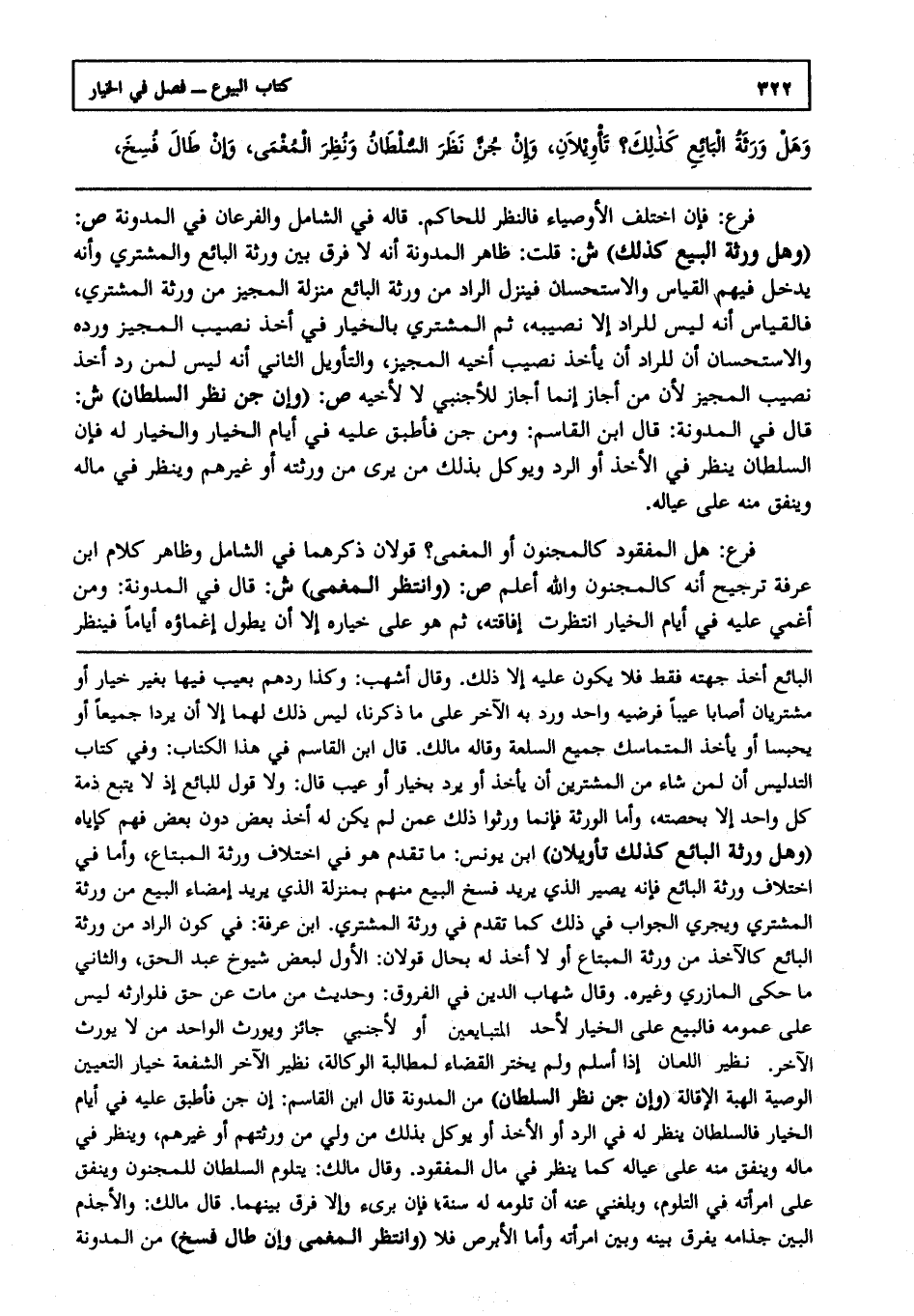 فرع: فإن اختلف الأوصياء فالنظر للحاكم قاله في الشامل والفرعان في المدونة ص: (وهل ورثة البيع كذلك) ش:قلت: ظاهر المدونة أنه لا فرق بين ورثة البائع والمشتري وأنه يدخل فيهم القياس والاستحسان فينزل الراد من ورثة البائع منزلة المجيز من ورثة المشتري فالقياس أنه ليس للراد إلا نصيبه، ثم المشتري بالخيار في أخذ نصيب المجيز ورده والاستحسان أن للراد أن يأخذ نصيب أخيه المجيز. والتأويل الثاني: أنه ليس لمن رد أخذ نصيب المجيز؛ لأن من أجاز إنما أجاز للأجنبي لا لأخيه.ص: (وإن جن نظر السلطان) ش: قال في المدونة: قال ابن القاسم: ومن جن فأطبق عليه في أيام الخيار، والخيار له فإن السلطان ينظر في الأخذ، أو الرد ويوكل بذلك من يرى من ورثته، أو غيرهم، وينظر في ماله وينفق منه على عياله.