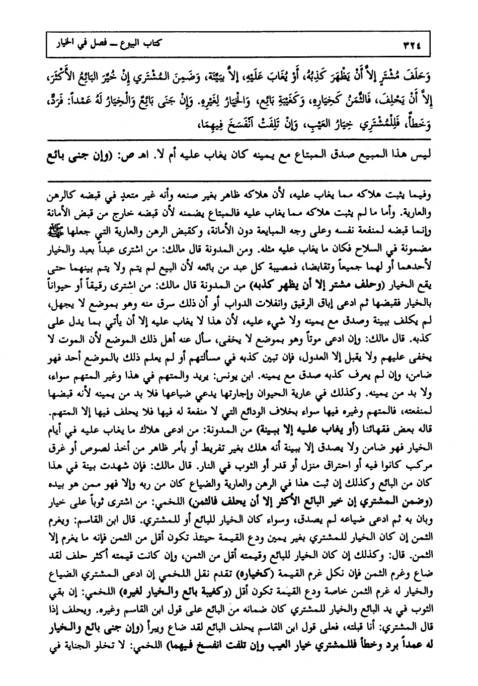 وحلف مشتر إلا أن يظهر كذبه أو يغاب عليه إلا ببينة, وضمن المشتري إن خير البائع الأكثر, إلا أن يحلف, فالثمن كخياره, وكغيبة بائع, والخيار لغيره. وإن جنى بائع والخيار له عمدا: فردّ وخطأ فللمشتري خيار العيب وإن تلفت انفسخ فيهما,