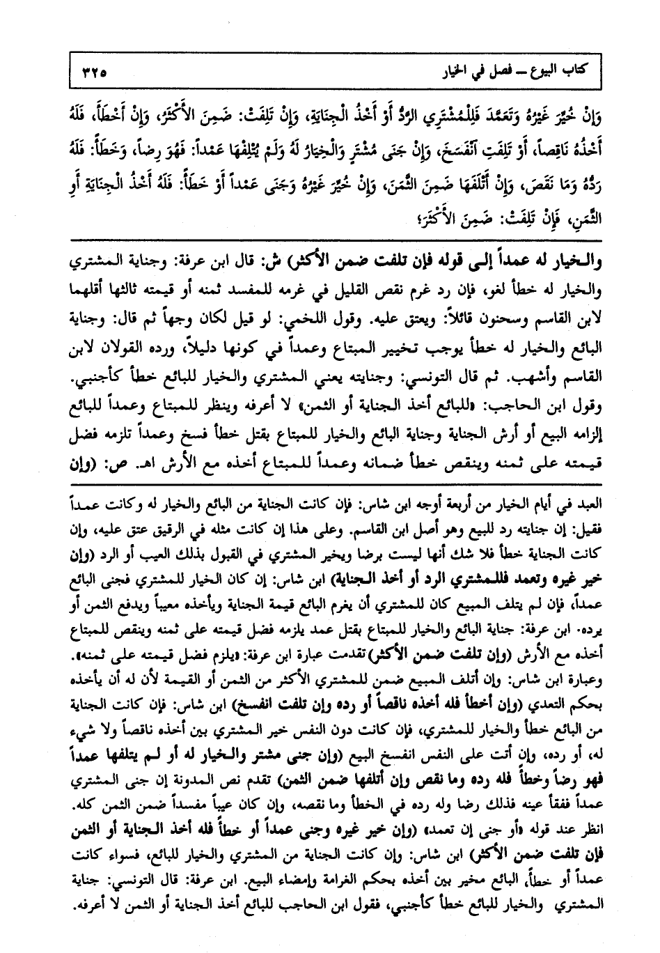 والخيار له عمدا إلى قوله: فإن تلفت ضمن الأكثر) ش قال ابن عرفة: وجناية المشتري والخيار له خطأ لغو، فإن رد غرم نقص القليل في غرمه للمفسد ثمنه، أو قيمته ثالثها: أقلهما لابن القاسم وسحنون قائلا ويعتق عليه وقول اللخمي لو قيل لكان وجها، ثم قال: وجناية البائع والخيار له خطأ يوجب تخيير المبتاع وعمد في كونها دليلا ورده، القولان لابن القاسم وأشهب، ثم قال التونسي: وجنايته يعني المشتري، والخيار للبائع خطأ كأجنبي، وقول ابن الحاجب "للبائع أخذ الجناية، أو الثمن" لا أعرفه وينظر للمبتاع وعمدا للبائع إلزامه البيع، أو أرش الجناية وجناية البائع، والخيار للمبتاع بقتل خطإ فسخ وعمدا تلزمه فضل قيمته على ثمنه وينقص خطأ ضمانه وعمدا للمبتاع أخذه مع الأرش ا هـ.ص: (وإن
