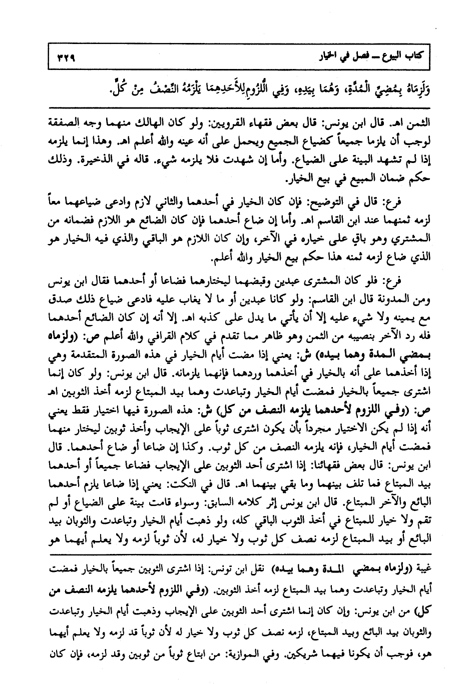 فرع: قال في التوضيح: فإن كان الخيار في أحدهما والثاني: لازم وادعى ضياعهما معا لزمه ثمنهما عند ابن القاسم ا هـ. وأما إن ضاع أحدهما، فإن كان الضائع هو اللازم فضمانه من المشتري، وهو باق على خياره في الآخر، وإن كان اللازم هو الباقي والذي فيه الخيار هو الذي ضاع لزمه ثمنه هذا حكم بيع الخيار، والله أعلم.
